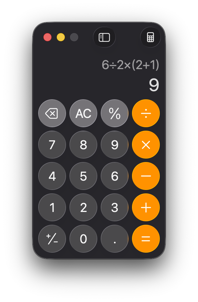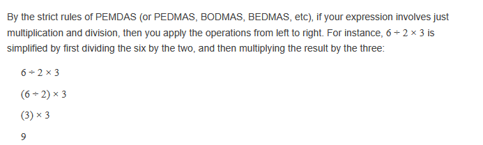 >>107831960PEMDAS, Left -> Right on same priority6 / 2 * (2 + 1)6 / 2 * 33 * 39
