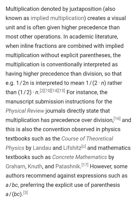 >>107834924>>107832260Ragebait?It doesn't matter that they are using '/' for division. You could replace it with '÷' and it would read the same and be relevant to OP because the point they are making is about multiplication when no sign for multiplication is used i.e. implicit multiplication.Very clearly states that the convention is to give implicit multiplication priority over division.