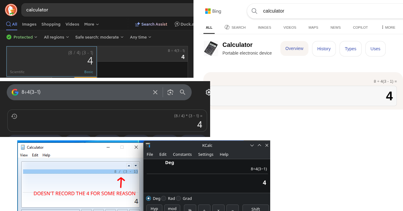 >Calculator says answer is 1>KCalc says answer is 9>both made by the same peopleThe fact that most of the thread doesn't even see the problem is humurous, maybe 4chan really is dead and only GPTs post here?