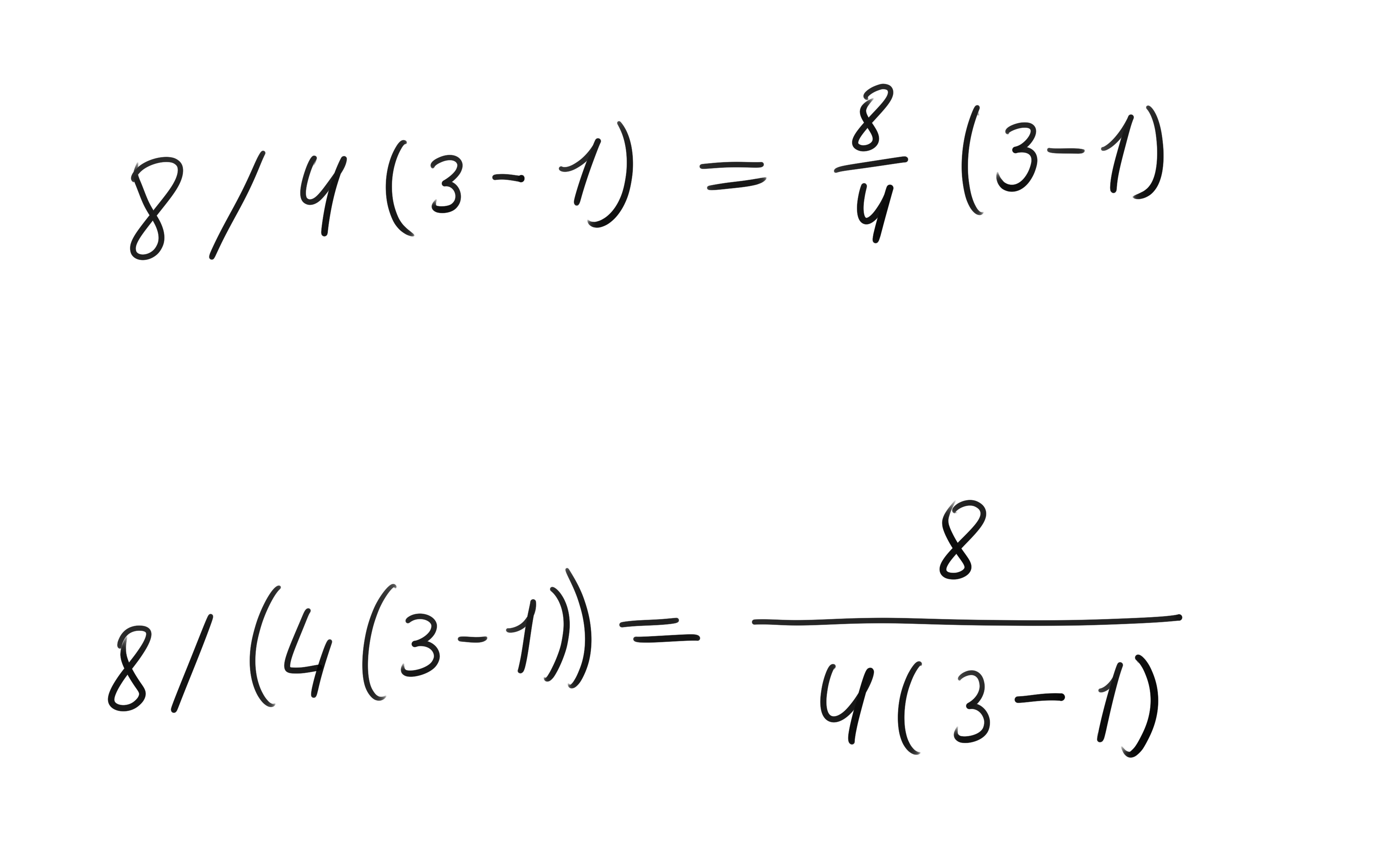 >>107835577I was taught math on paper, we would write everything on paper and use the big long horizontal lines for division. For programming I simply substitute the lines with parenthesis for clarity, it breaks everything down into identifiable pieces and makes it easier to read.