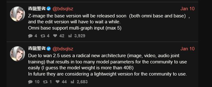 >>107837142>What does multi-graph input mean?multiple images input I guess, they said that Z-image edit was only able to take 1 image input, what that means is that they probably trained base further to go for 5 and then had to remake Z-image edit from that so that it can now take multiple image edit, that would explain that long delay, my theory is that they didn't believe this project was that great and were half hassing its features, but now that Z-image base is the most anticipated model of all time they feel they have to do this the right way (yeah I know I'm coping hard but heh :( )