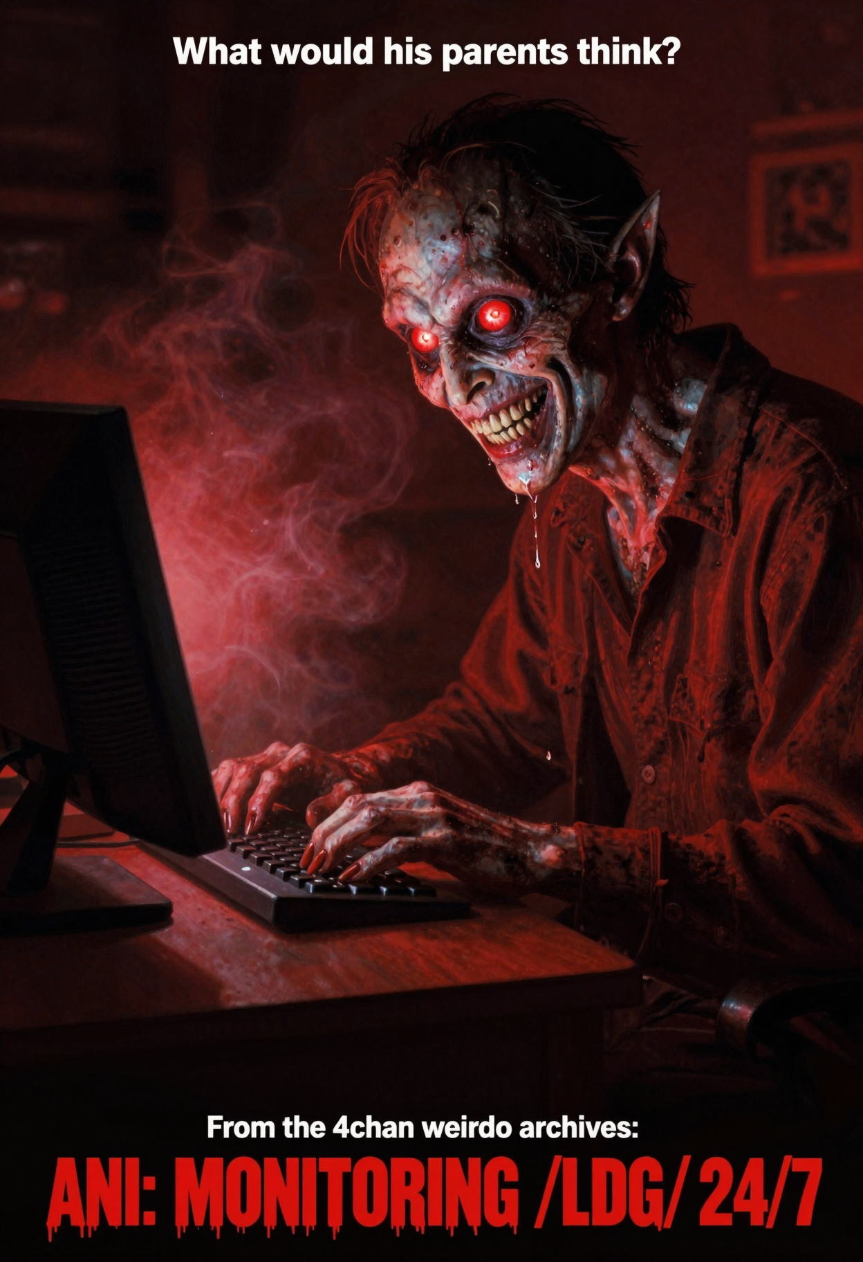 >>107838024nice prompt brotry thisa violently textured nightmare-dreamscape where the Arctic Ocean heaves under a sky split open by neon-green auroras, their tendrils smeared across the canvas like radioactive ectoplasm. Thick, crusted impasto strokes—some nearly an inch thick— choppy black waves, their edges globbed with titanium white and cobalt blue straight from the tube. In the distance, a ghostly sailing ship lists drunkenly, its portholes glowing like jaundiced eyes through a fog of palette knife-scraped mist, while the entire painting vibrates with the frenetic energy of a hallucination, colors swirling into each other where the artist’s brush clearly lost all patience. The longer you stare, the more the paint itself seems to move: frozen waves become teeth, the ship’s rigging transforms into a skeletal hand, and the auroras drip like melting celluloid from a burned film reel. It’s less a painting and more a feverish artifact—something recovered from a sailor’s locker after he vanished into the ice, his final trip documented in furious, psychedelic strokes.