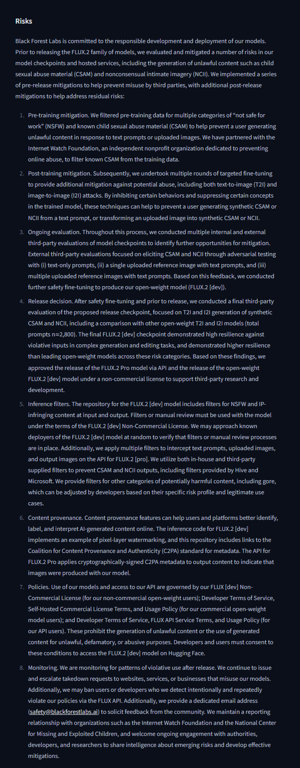 >>107837677>I also wonder if they actually do want to get a good result for local usersthey hate local, but they know they won't be relevant without us talking about their models all the time, our free advertisment power is actually pretty hugehttps://huggingface.co/black-forest-labs/FLUX.2-dev#risks