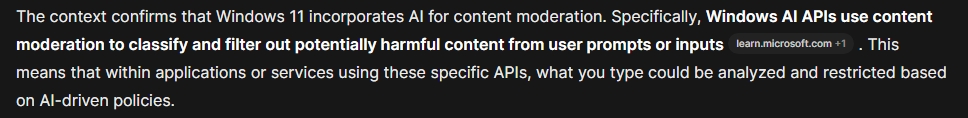 >>107843974Yes it true atm if you use certain microsoft products i.e. Phi Silica and Imaging API's.>The context confirms that Windows 11 incorporates AI for content moderation. Specifically, Windows AI APIs use content moderation to classify and filter out potentially harmful content from user prompts or inputs learn.microsoft.com +1. This means that within applications or services using these specific APIs, what you type could be analyzed and restricted based on AI-driven policies.>https://learn.microsoft.com/en-us/windows/ai/apis/content-moderation