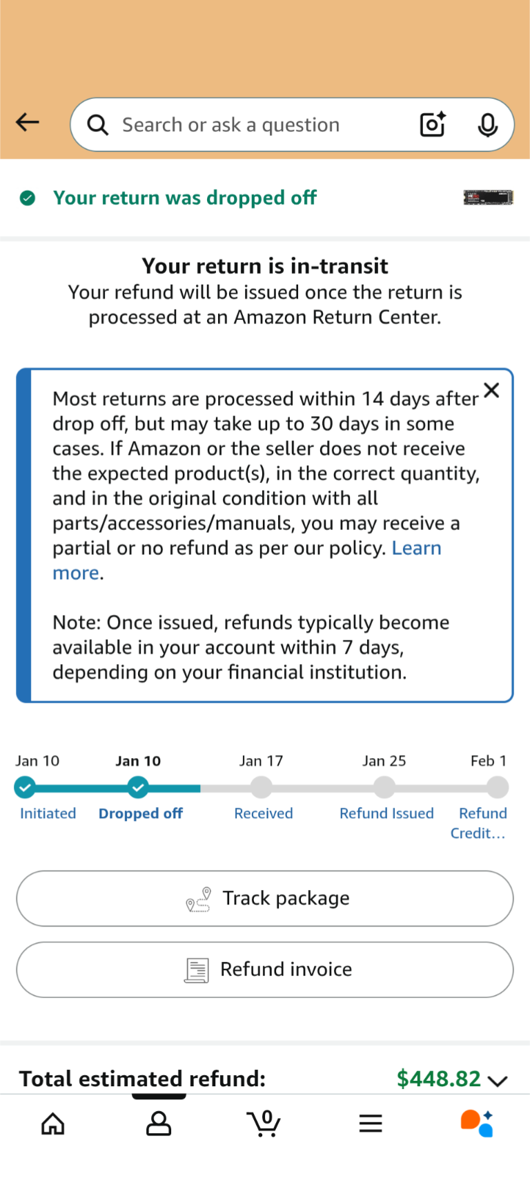 >>107846893>>107846844Whole Foods drop off really expedited my back to credit card returns.Just returned an NVME myself.Takes about 3 weeks.