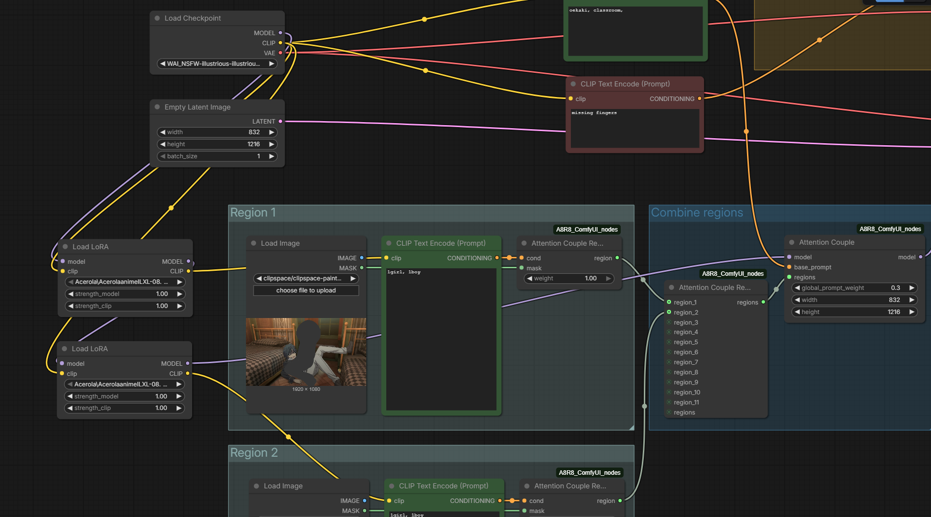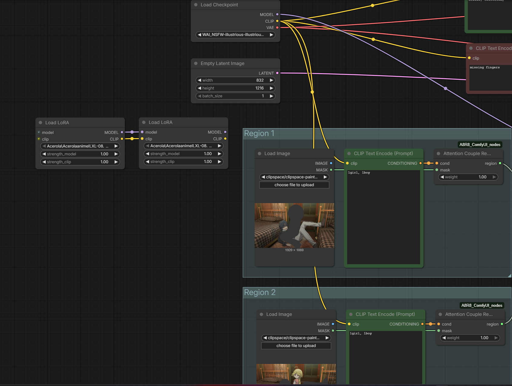 >>107847592>The Checkpoint again?No. You daisy chain the loras.Checkpoint > Lora 1 > Lora 2 > Attention Couple