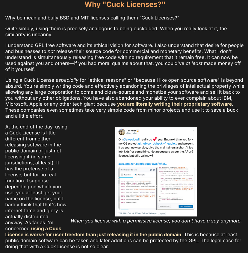 >>107862166>Vast majority of new projects are licensed under MITOnly Rust-tranny/globohomo projects>Rust doesn't stop you from using GPLBut Rust trannies sure as hell love to tell you GPL is bad actually and that you should use a cuck license instead>It just that no one wants to use a license that limits your freedom so muchCase in point