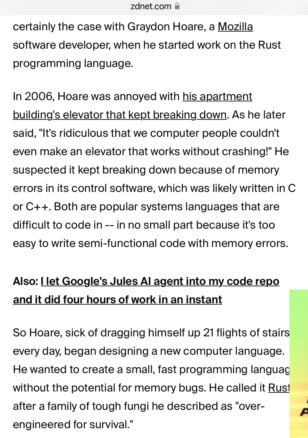 >>107863549I was talking about valgrind and c.Why are you unnecessarily talking about rust and bringing attention to it and yourself?Windows is written in C.Minix on the intel processors is written in C.Unix is written in C.C was invented to create Unix.Rust was “invented” to replace C++ because some retard’s elevator was broken and he “guessed” it was written in C++ (it wasn’t). Jesus fuck…https://www.zdnet.com/article/rust-turns-10-how-a-broken-elevator-changed-software-forever/Rust folks have tried to scrub this from the internet, but largely failed as evidenced here.