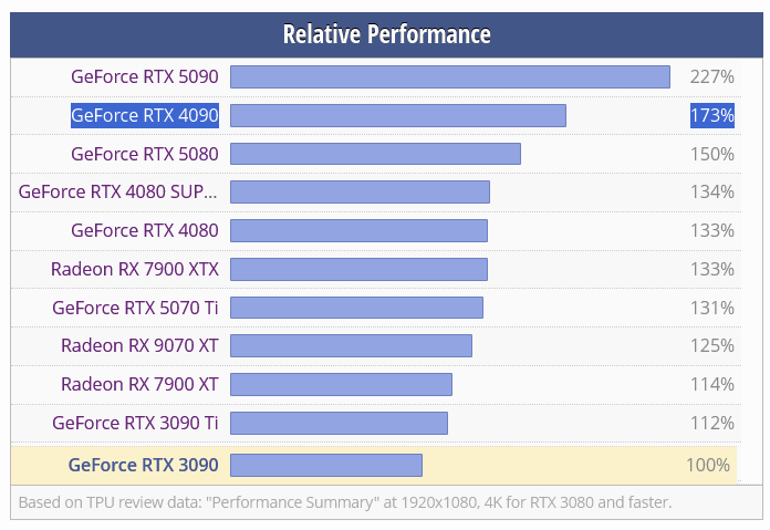 >>107859463There's no way the 4090 is twice is fast. Only if you're counting using DLSS or some shit. Natively it's only like 30-40% faster at best.