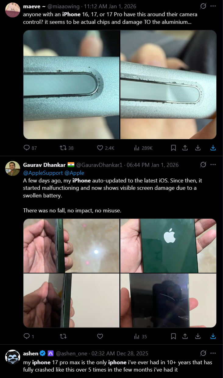>>107866453>these fake as shit retardsWhen there's actual issues:https://www.macrumors.com/2025/12/30/iphone-17-pro-static-noise/