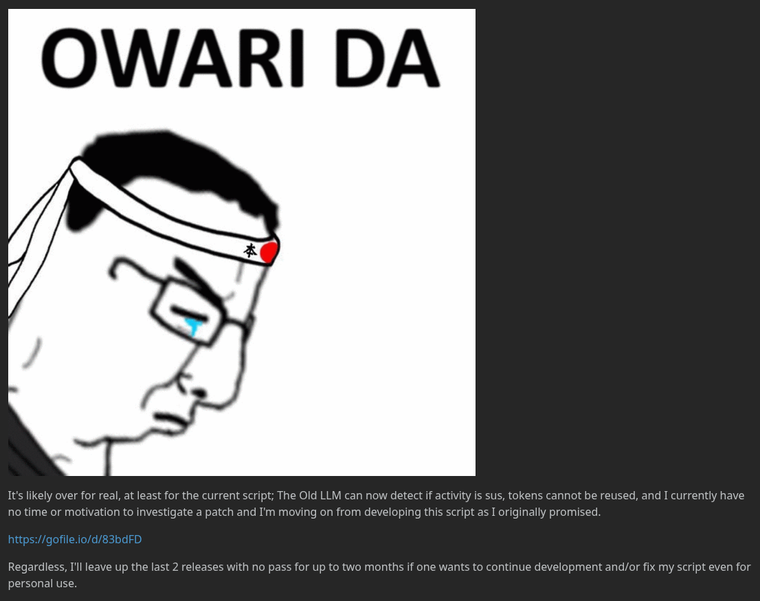 Should I still release an updated TamperMonkey and Python script as promised? They no longer work due to updates on the website related to suspicious activity and integrity, but if one wanted to continue development even for personal use...