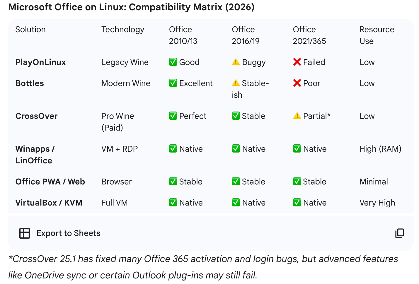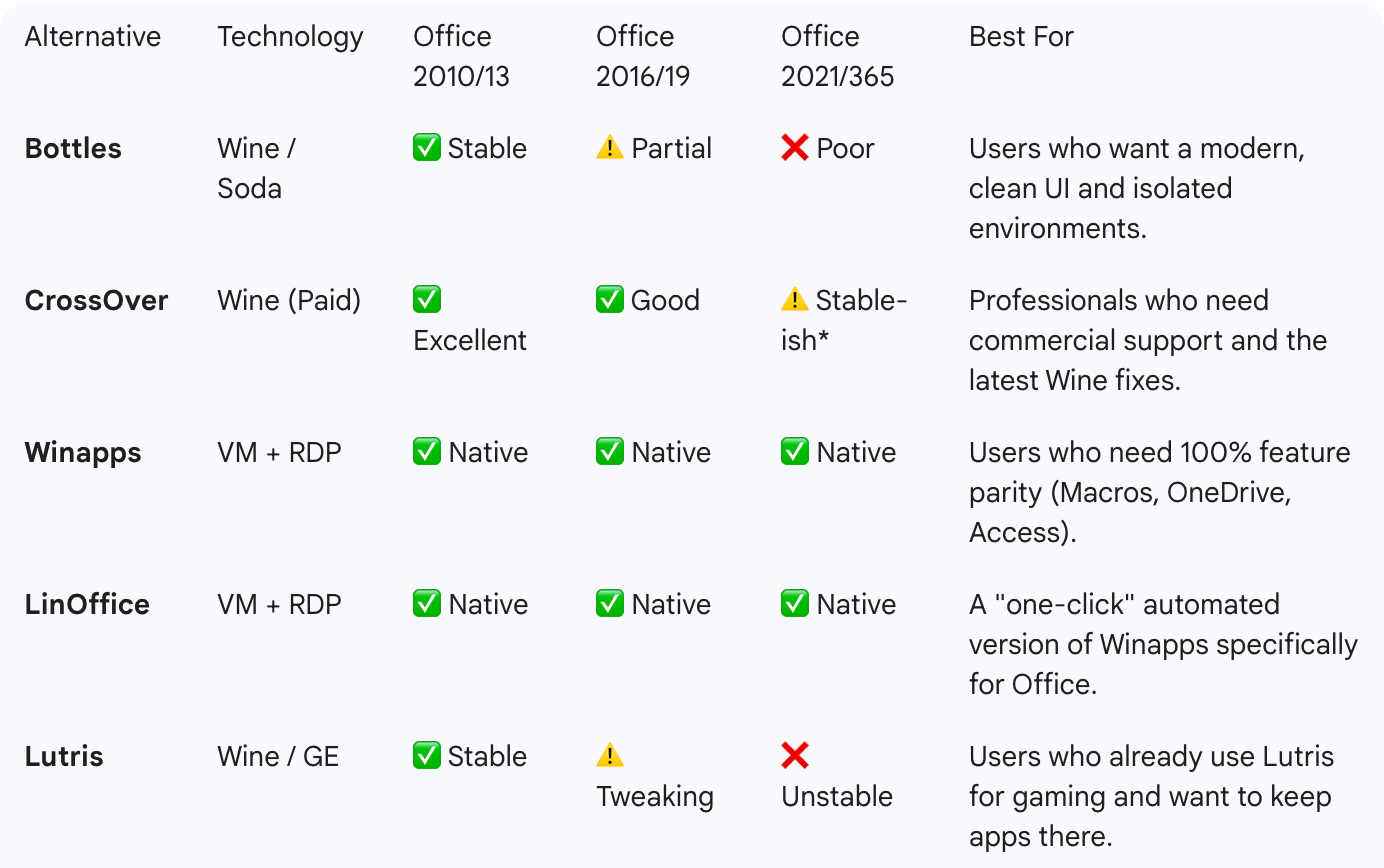 >>107880143I thought that shit used to work with wine but it's not like anyone would notice if it stopped working since MS Office is cancer anyway. Basically, I would normally insist on LibreOffice unless your line of work *requires* MS Office.You really want a Wine wrapper app (like the now unmaintained PlayOnLinux) in order to install a Windows application. I asked Gemini to make this table for you so you can see what the typical solutions are.
