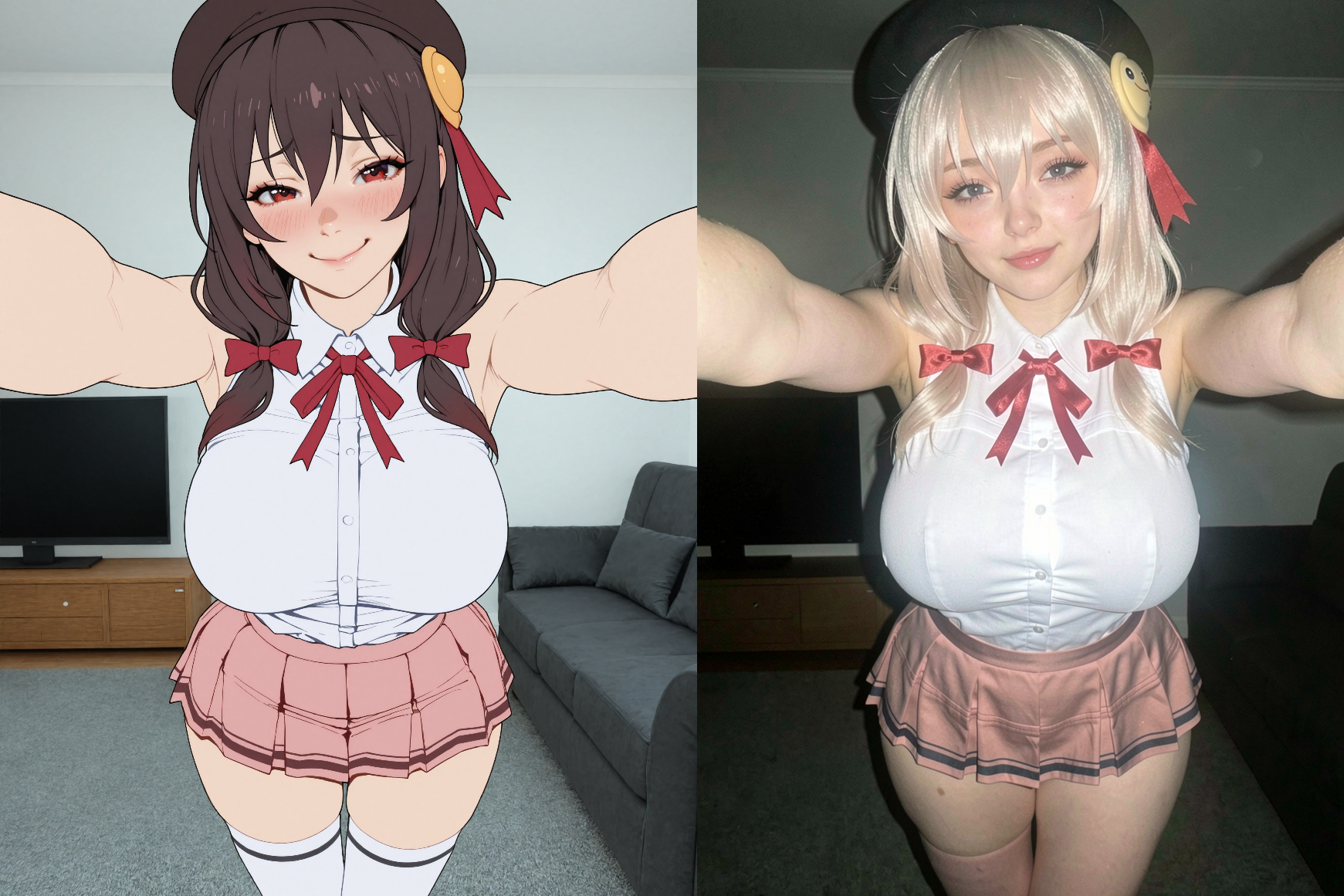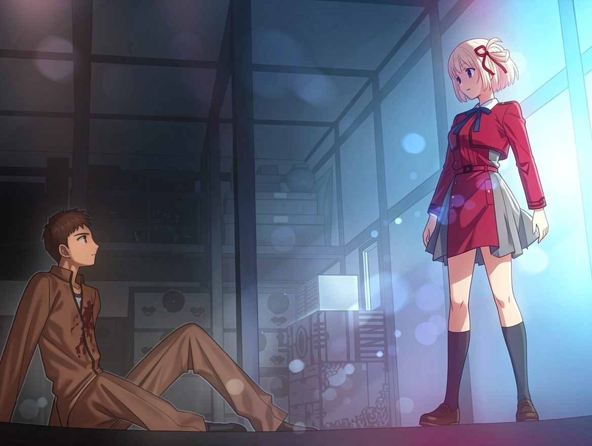>Replace the girl on the right in image 1 with the girl in image 2. She should have the same pose as the girl in image 1, but have her outfit and facial expression from image 2 while looking at the boy on the left. She should not be wearing armor.Damn, I can't believe this largely just werks.