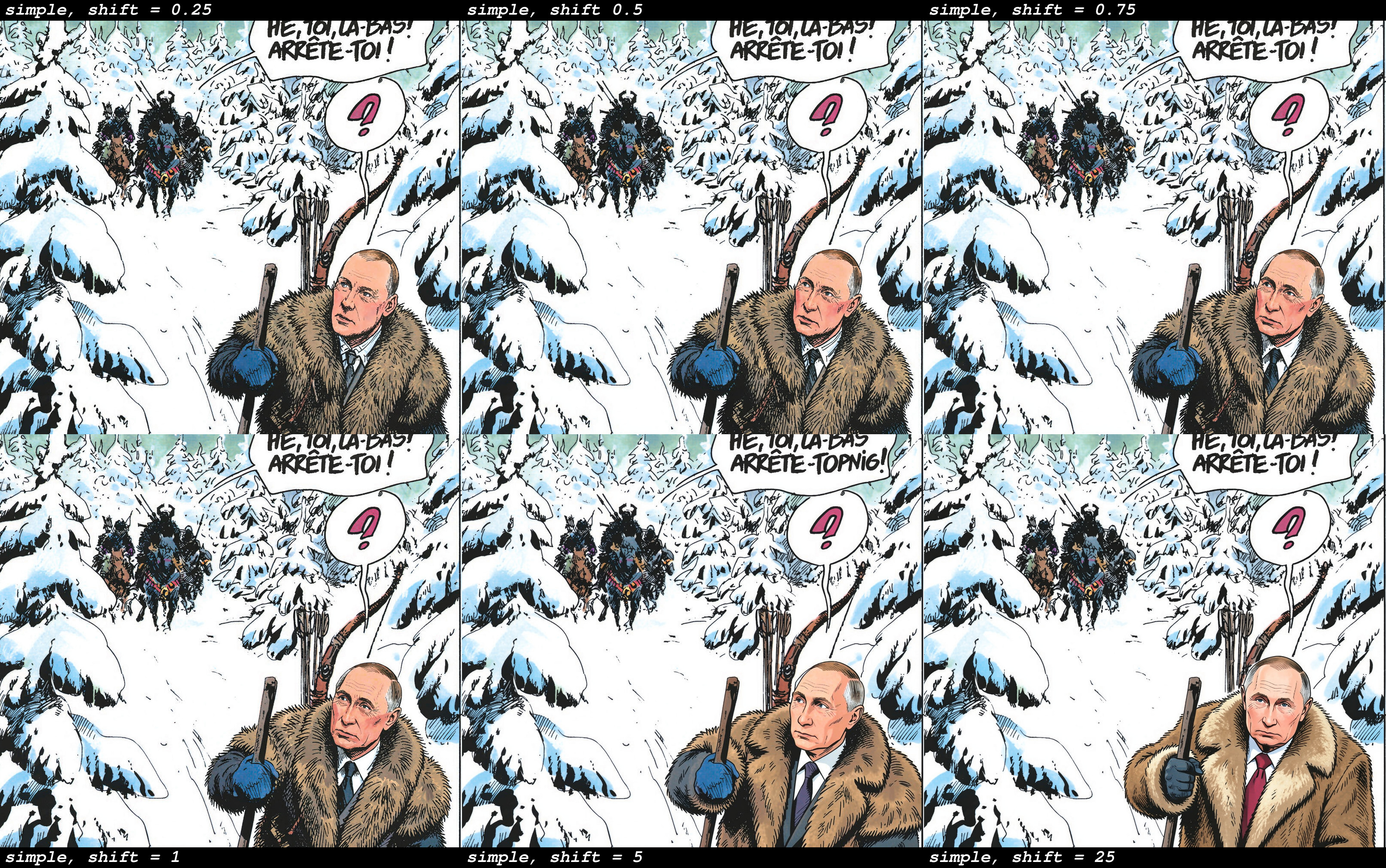 >>107880752klein distill editeuler, simple, 8 stepsModelSamplingAuraFlow for shift, >Make the man in the front Vladimir Putin. He is wearing furs