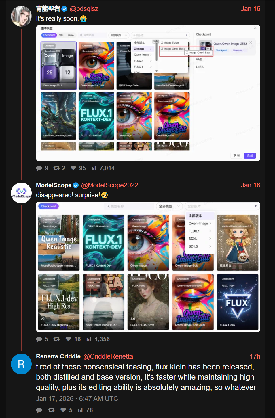>>107895145>I wonder what the marketing idea behind that teasing is though, unless they're actually still finetuning behind the scenesI have no idea wtf they are doing, I thought they were just waiting for Klein to be released to dunk on BFL again, and it didn't happen, what are they waiting for? fucking CHINESE CULTURE