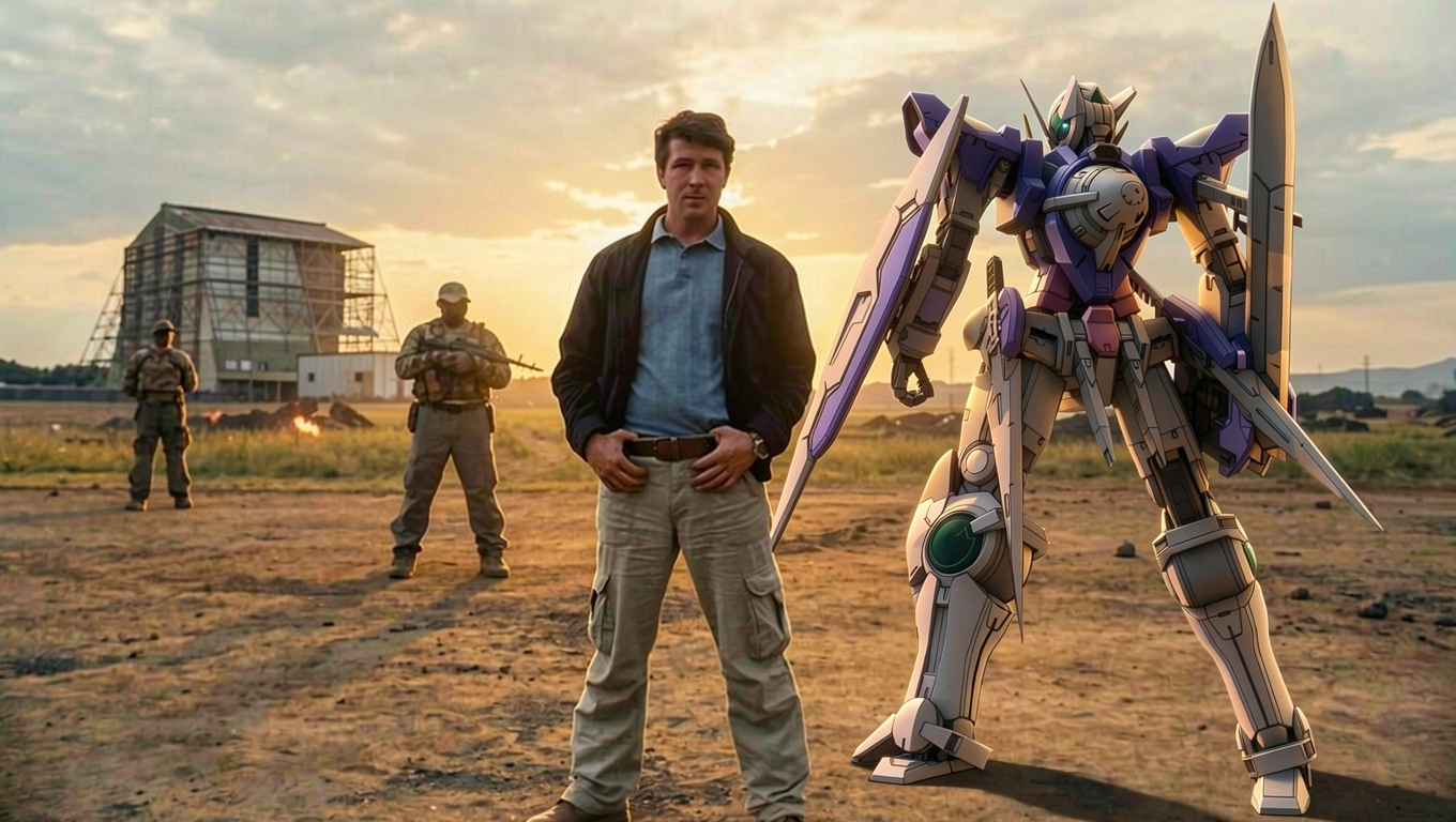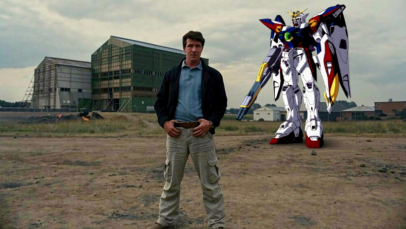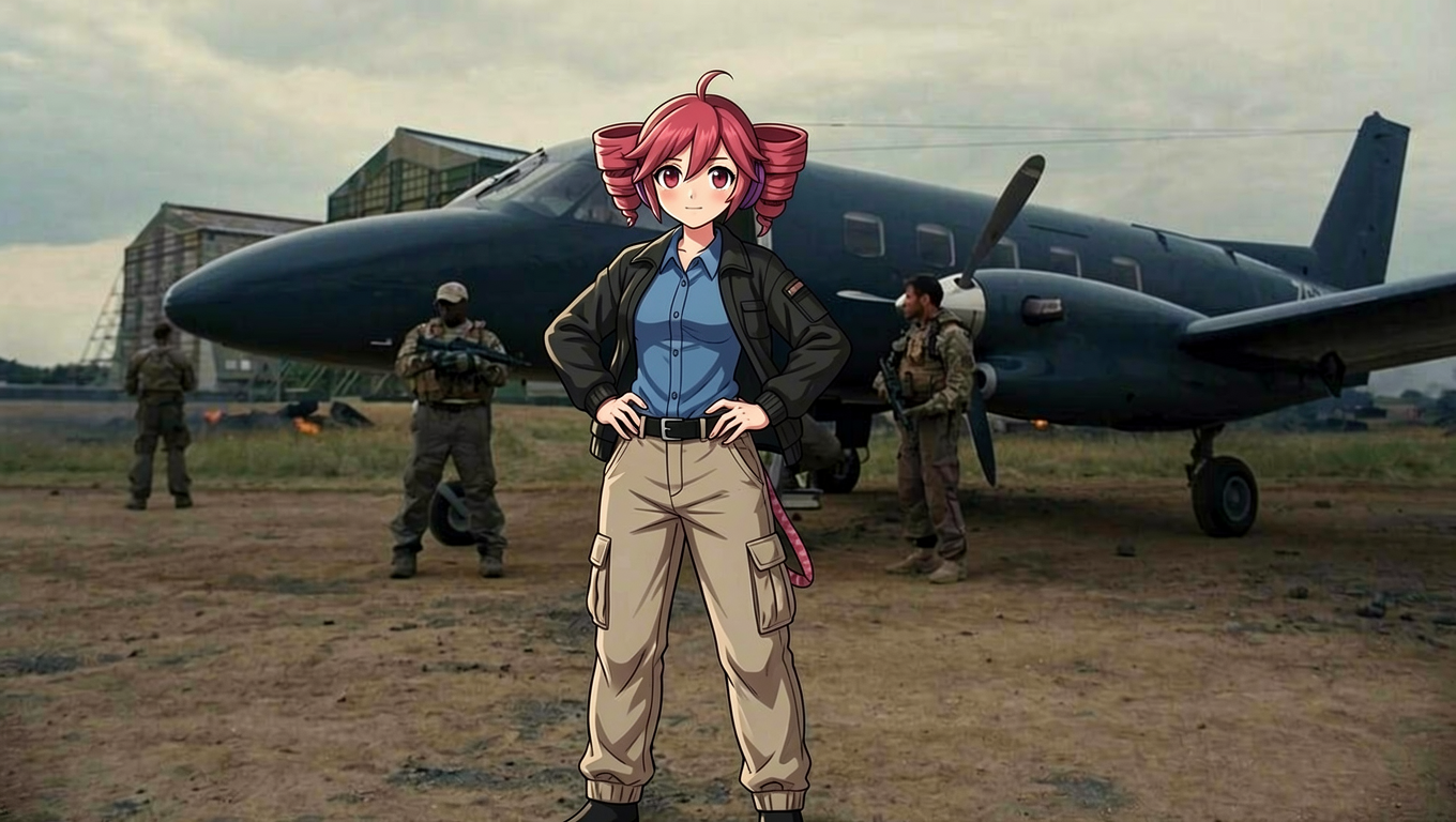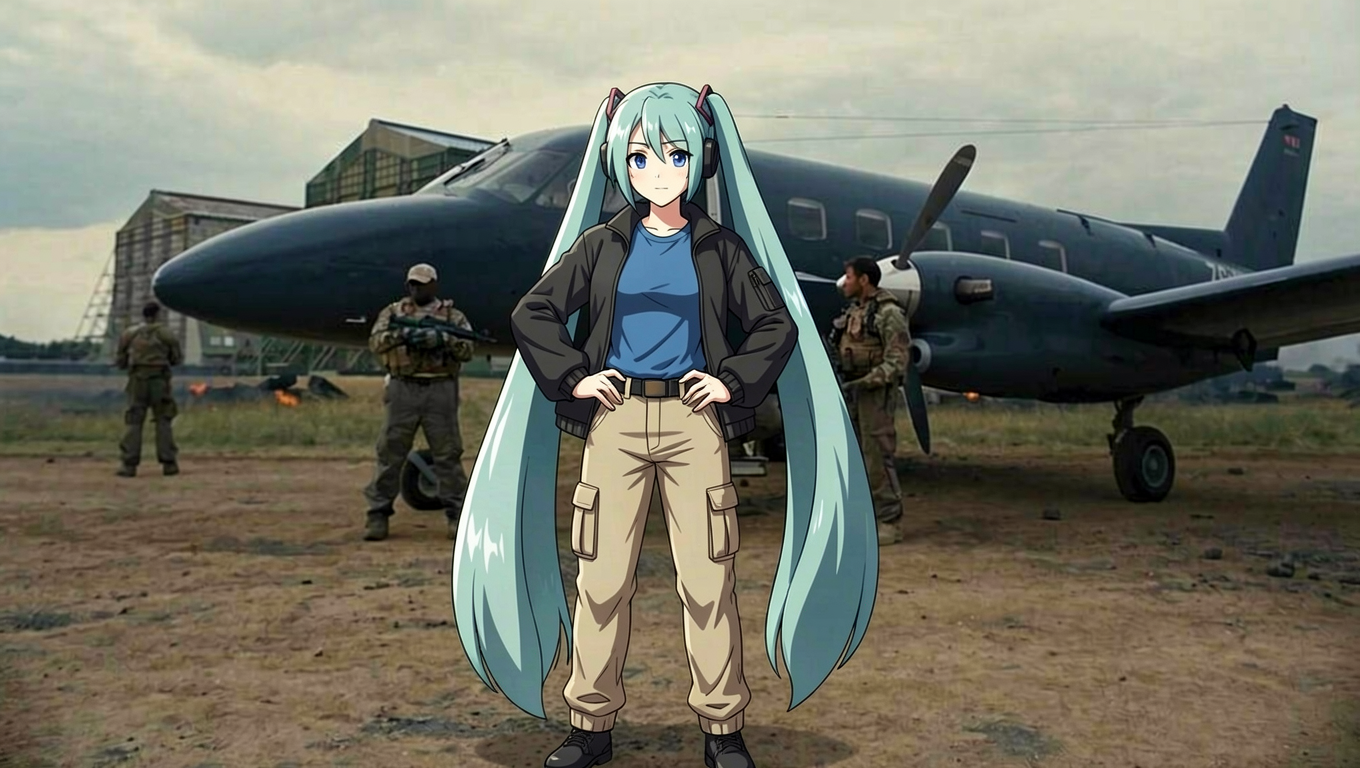 replace the man in the blue shirt in image 1 with the anime girl in image 2 wearing a blue shirt, black jacket, and beige cargo pants, with her hands on her waist.