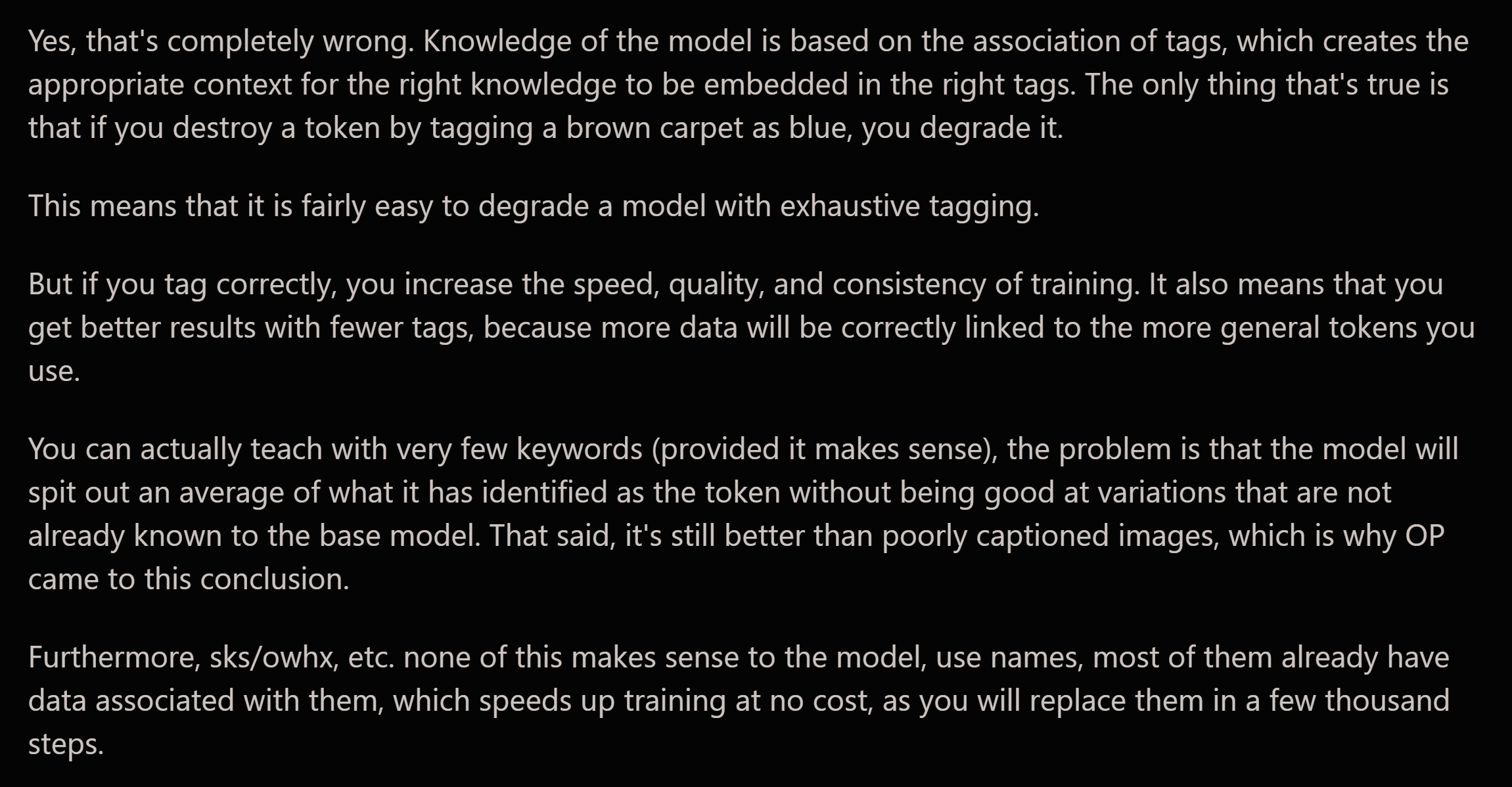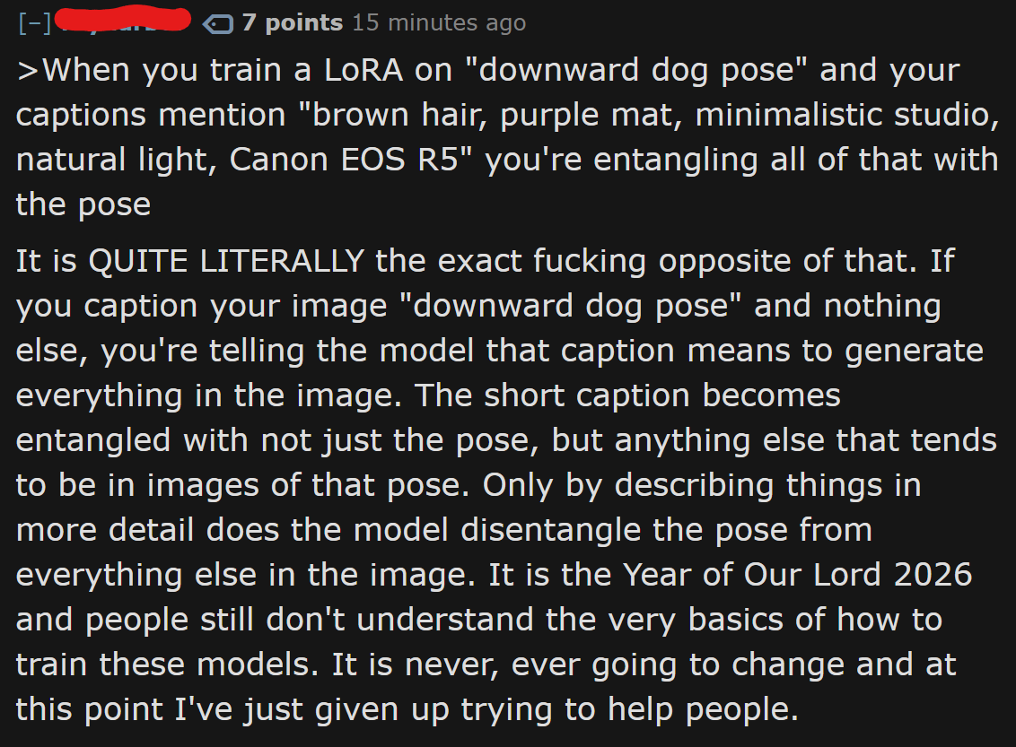 >>107895647With a single concept, and enough diverse images, you can often get away with short captions. But it can go wrong.Suppose half of your downward dog images have a blue vase in the corner. If your captions are just "downward dog pose" the model learns that half the time there should be a blue vase in the corner. It got entangled, the model has a tendency to make a blue vase when prompting for that pose.If you caption those images "downward dog pose, but also there is a blue vase in the corner", the model learns to only generate a blue vase when you specifically mention a blue vase (because that's exactly how it was captioned). It disentangled the concept. Basically what >>107895690 said: "everything not captioned becomes implied".Also I just realized that ledditor is the Pyro guy who makes the shitty overfit SDXL porn models. Not exactly a preeminent ML researcher here lmao.