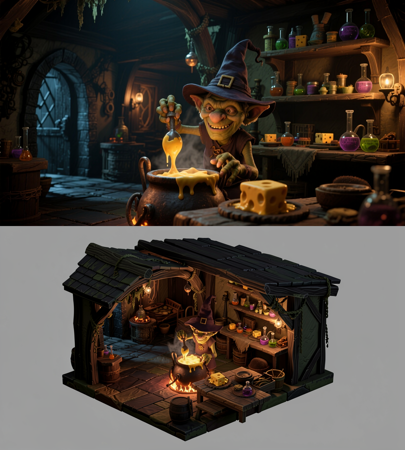 2D isometric perspective view of the scene in Image 1, 45 degree angle, plain background