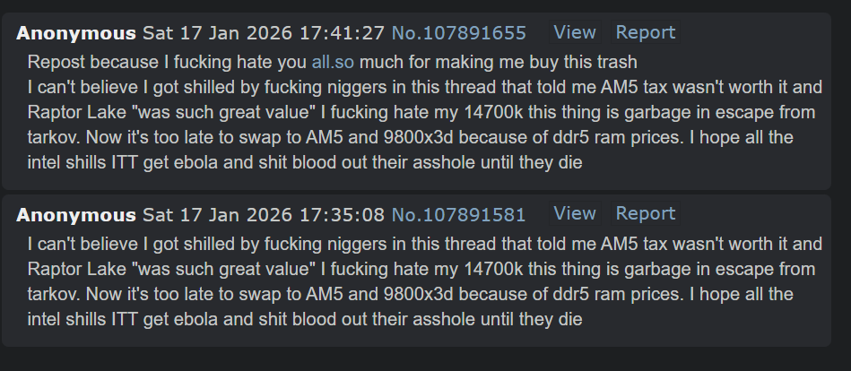 I can't believe I got shilled by fucking niggers in this thread that told me AM5 tax wasn't worth it and Raptor Lake "was such great value" I fucking hate my 14700k this thing is garbage in escape from tarkov. Now it's too late to swap to AM5 and 9800x3d because of ddr5 ram prices. I hope all the intel shills ITT get ebola and shit blood out their asshole until they die
