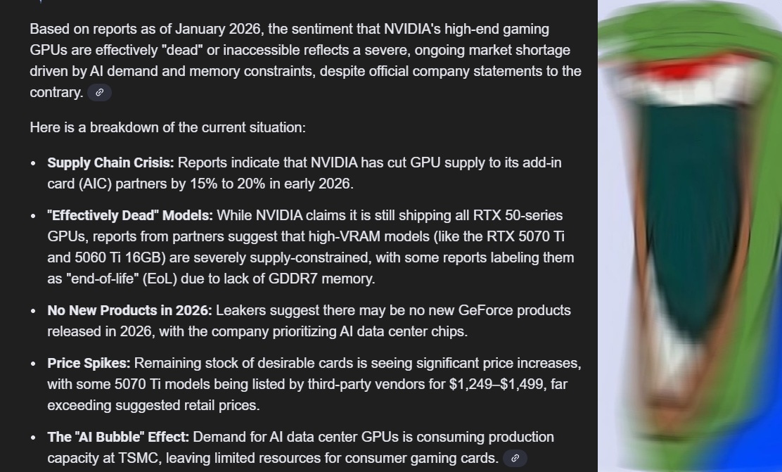 https://www.youtube.com/watch?v=hZMAoC50iOwMLID says entire 50 series is dead and Nvidia is exiting the consumer GPU market