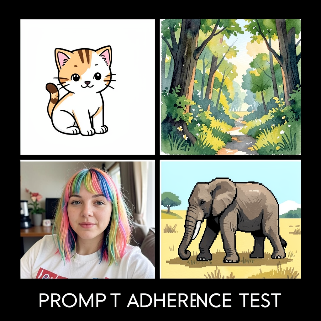 Klein has quite strong "style separation", even with the 4B Distilled.Prompt:```a black square divided into four equally sized quadrants by bold white lines. In the top-left quadrant is vector art of a cute kitten. In the top-right quadrant is a watercolor painting of a lush green forest on a summer day. In the bottom-left quadrant is a candid amateur instagram photograph of a young woman with her hair dyed multiple colors. In the bottom-right quadrant is pixel art of a majestic adult elephant grazing on the savannah. At the bottom of the image below the square is text that reads "PROMPT ADHERENCE TEST".```