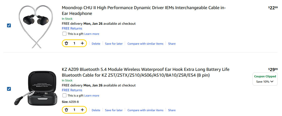 >>107906358$4 cheaper than what I bought em for, nice. those KZ foam tips will degrade in about a month, though. I like foams but theirs just break apart after some moderate usage.