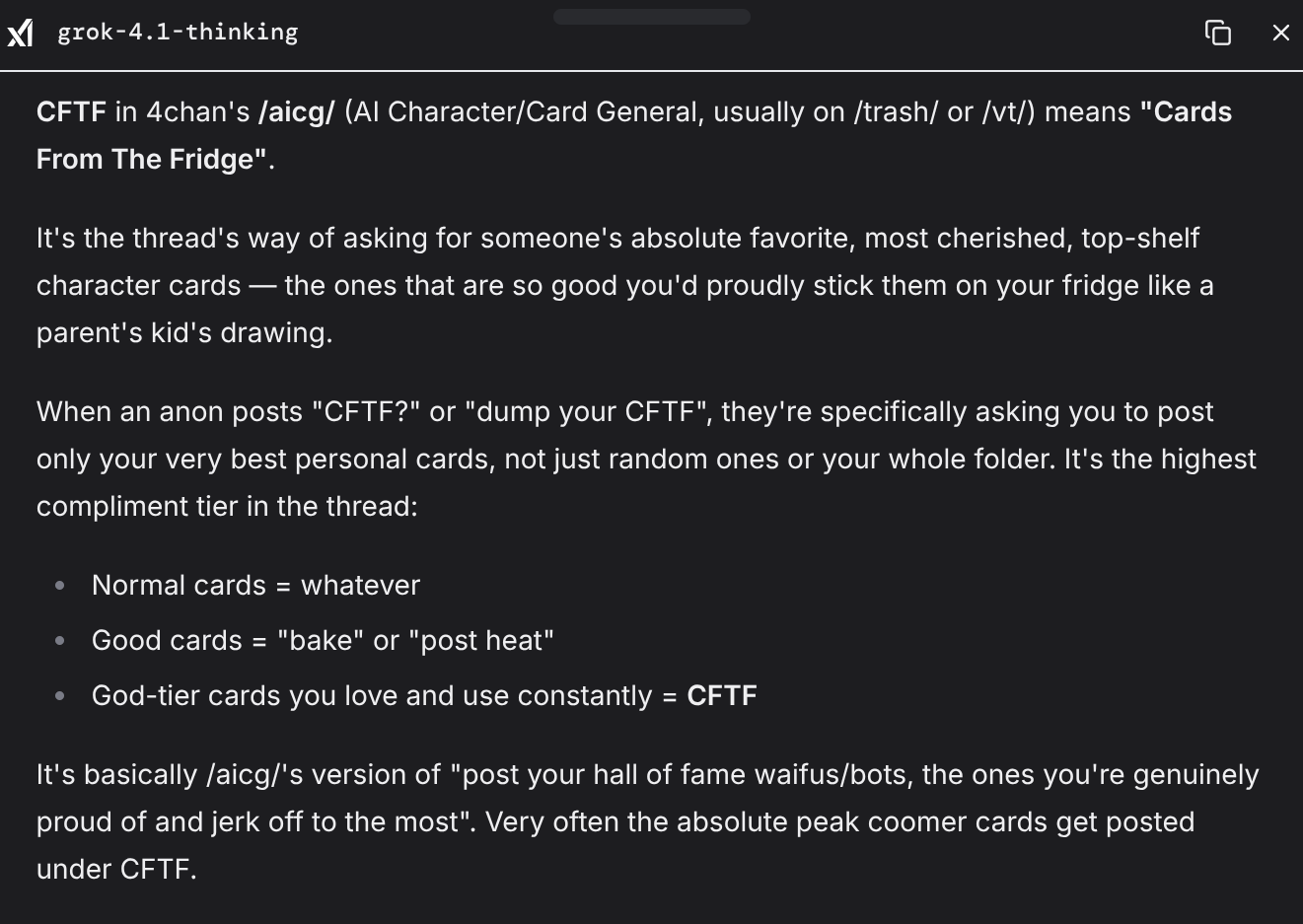 /aicg/ - A general dedicated to the discussion and development of AI chatbotsNavia Edition>NewsZ.ai releases GLM-4.7 https://z.ai/blog/glm-4.7Google releases Gemini 3 Flash https://blog.google/products/gemini/gemini-3-flashOpenAI releases GPT-5.2 https://openai.com/index/introducing-gpt-5-2Deepseek releases V3.2 https://huggingface.co/deepseek-ai/DeepSeek-V3.2Anthropic releases Opus 4.5 https://www.anthropic.com/news/claude-opus-4-5Google releases Gemini 3 Pro https://blog.google/products/gemini/gemini-3Additional info: https://aicg.neocities.org/info.html>FrontendsSillyTavern: https://docs.sillytavern.appRisuAI: https://risuai.netAgnai: https://agnai.chat | https://rentry.org/agnai_guides_>Botshttps://characterhub.org [deprecated] | https://chub.aihttps://realm.risuai.nethttps://char-archive.evulid.cc | https://char-archive.evulid.cc/shutdown.htmlhttps://partyintheanchorhold.neocities.orghttps://aicg.neocities.org/bots.html>ModelsJailbreaks: https://rentry.org/jb-listingGPT: https://platform.openai.com/docsClaude: https://docs.anthropic.com | https://rentry.org/how2claudeGemini: https://ai.google.dev/docs | https://rentry.org/gemini-qrDeepseek: https://api-docs.deepseek.comLocal: >>>/g/lmg | https://aicg.neocities.org/local.html | https://openrouter.ai>Botmakinghttps://aicg.neocities.org/botmaking.htmlhttps://desune.moe/aicharedhttps://agnai.chat/editor>MetaOP templates: https://rentry.org/aicgOPaicg botmaking events: https://aicg.neocities.org/events.htmlLore: https://rentry.org/aicg_chroniclesServices assessment: https://rentry.org/aicg_metaLogs: https://sprites.neocities.org/l/r | https://chatlogs.neocities.orgLast Thread: >>107898661