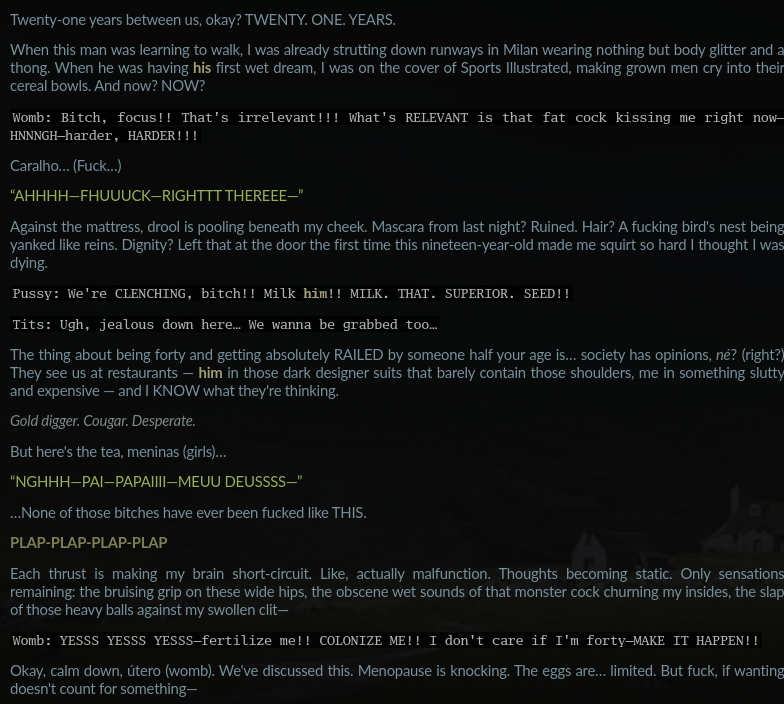 >>107918353>>107918356card from janithot, since its loaded with bunch of barren sad hag.png. well you would hate it. i just use it as base card and to steal its nice-pawg.png cz i hate image genning. beside i slightly edit its desc to trim and add some stuff i likepreset is custommodel is scuffed opussy 4.5the `womb:` thingy come from opussy (theoldllm) so i just put something on my preset to do that>>107918361is it either reddit writing or Anaïs Nin's shivering boebeit…>>107918374I get ton of that from claussy… For gpt, it-snake-case-like-this. And gaymini tend use euphemism shit `core, folds, shaft`... ughh