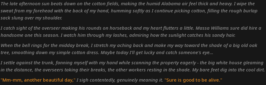 >>107918344Jesus christ, what a log!Would you mind linking the bot, or at least the preset? I really like the way it's written. If you don't want to share it, at least point me in the right direction to get it like that.Oh, and, what model?