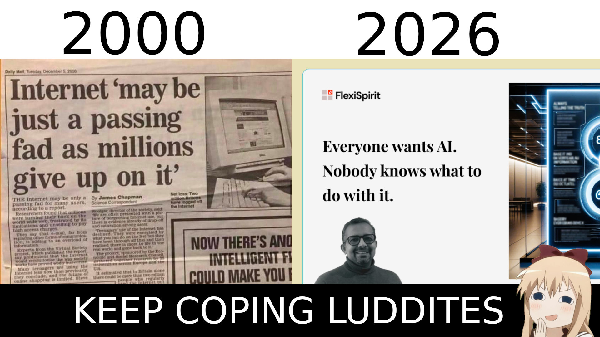 Just like journalists ripped their asses off decades ago to claim that the internet was a waste of time that nobody used, they do the same today. They invent lies about nobody using AI, even though my grandmother literally uses it to generate good morning texts. They say AI is not capable of producing code, even though several famous programmers have started using AI in recent months. The only ones I see saying that AI is bad are anonymous programmers here or on leddit, useless programmers, by the way.There's clearly seething happening right now. I know it's hard to realise that your profession is obsolete, but it's better to accept it now and look for something else than to insist on the mistake and tomorrow it will be too late.Don't be a Luddite.