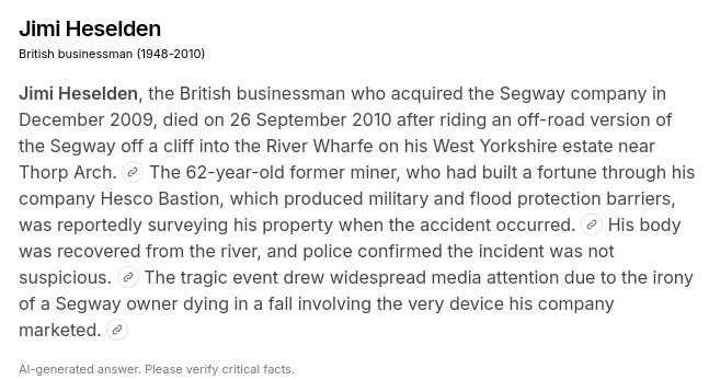 >>107925199>>Segway>fun fact:>the owner of the company rolled off a cliff in his own product and died