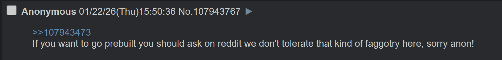 >>107943767Indeed. Pic related is the only faggotry we allow here.>>107943473Read.The.Sticky. No details = stupid waste of post count.>>UPGRADE & BUILD ADVICE>Post build list or current specs: https://pcpartpicker.com/>Provide specific use cases and your BUDGET and COUNTRY