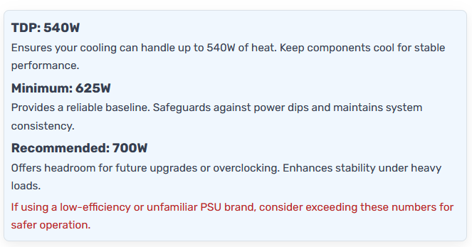>>107946522I'd also put in a recommendation for a 1200w+ PSU for a 5090 build. I've got a 9800x3d and 5090 on a 1000W PSU I was hoping would be fine and before I undervolted the card my system did that hard shutdown thing once when running at full tilt, so it's right at the edge, and forget a cpu upgrade from here.