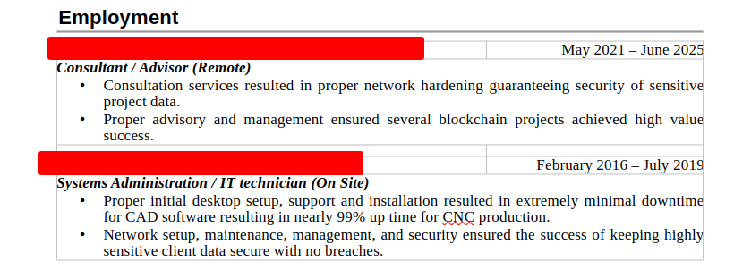 >>107985378>2 columns>font size for ants >"passions" section >first word of the resume is "enthusiastic"Into the trash it goes Here's the biggest TRVTHNVKE advice I can give to the resumeslop writers ITT:Imagine you're a burned out lead dev. You have an upcoming interview with (your name), so to "prepare" you click on the "resume" link of the HR software and plan to skim through.What would your first thought be if you were greeted with this fucking wall of text?