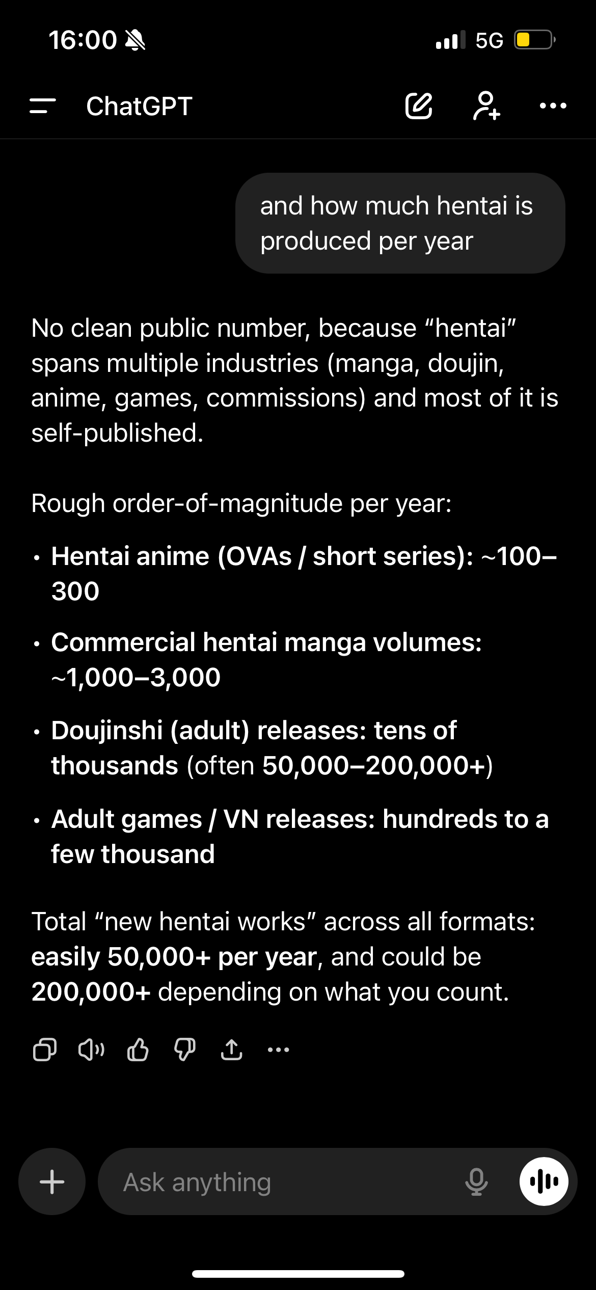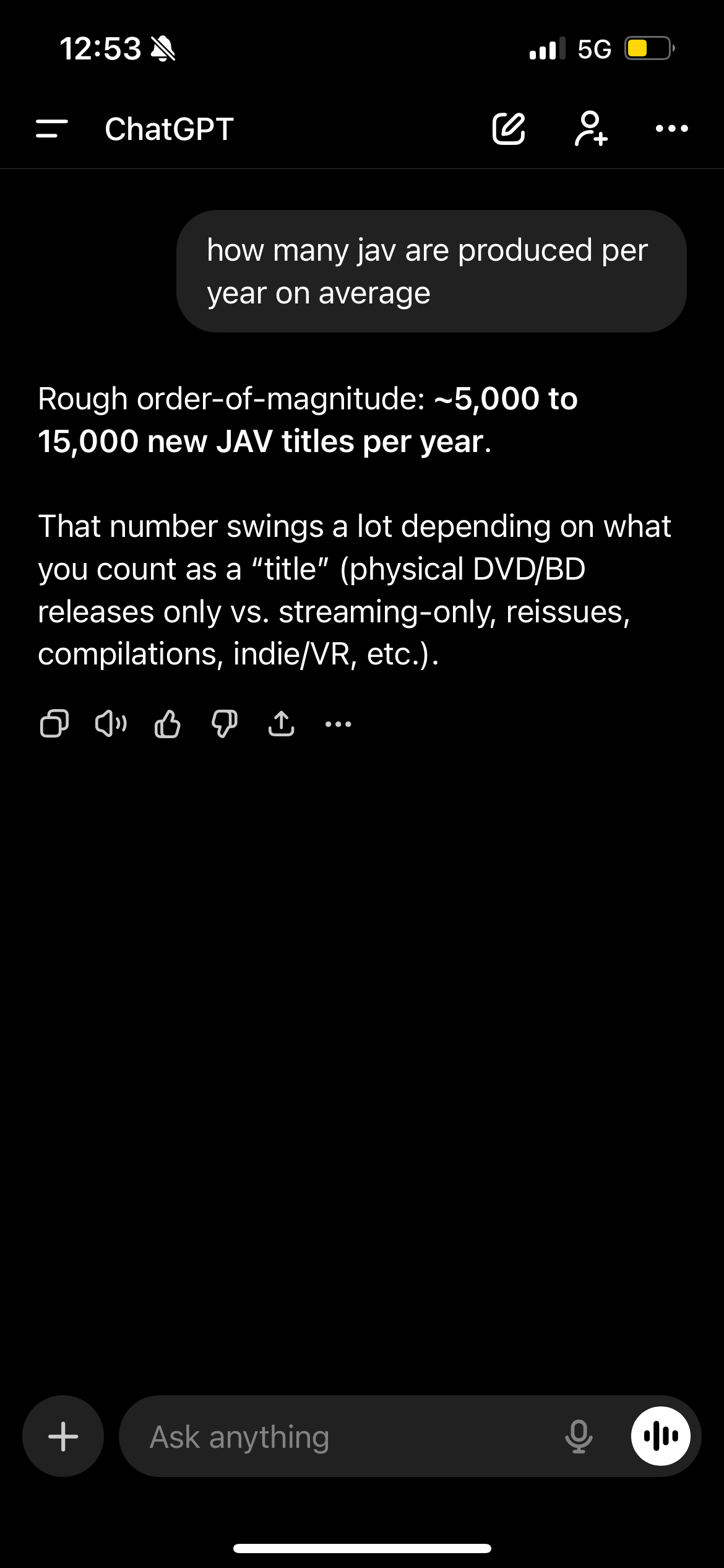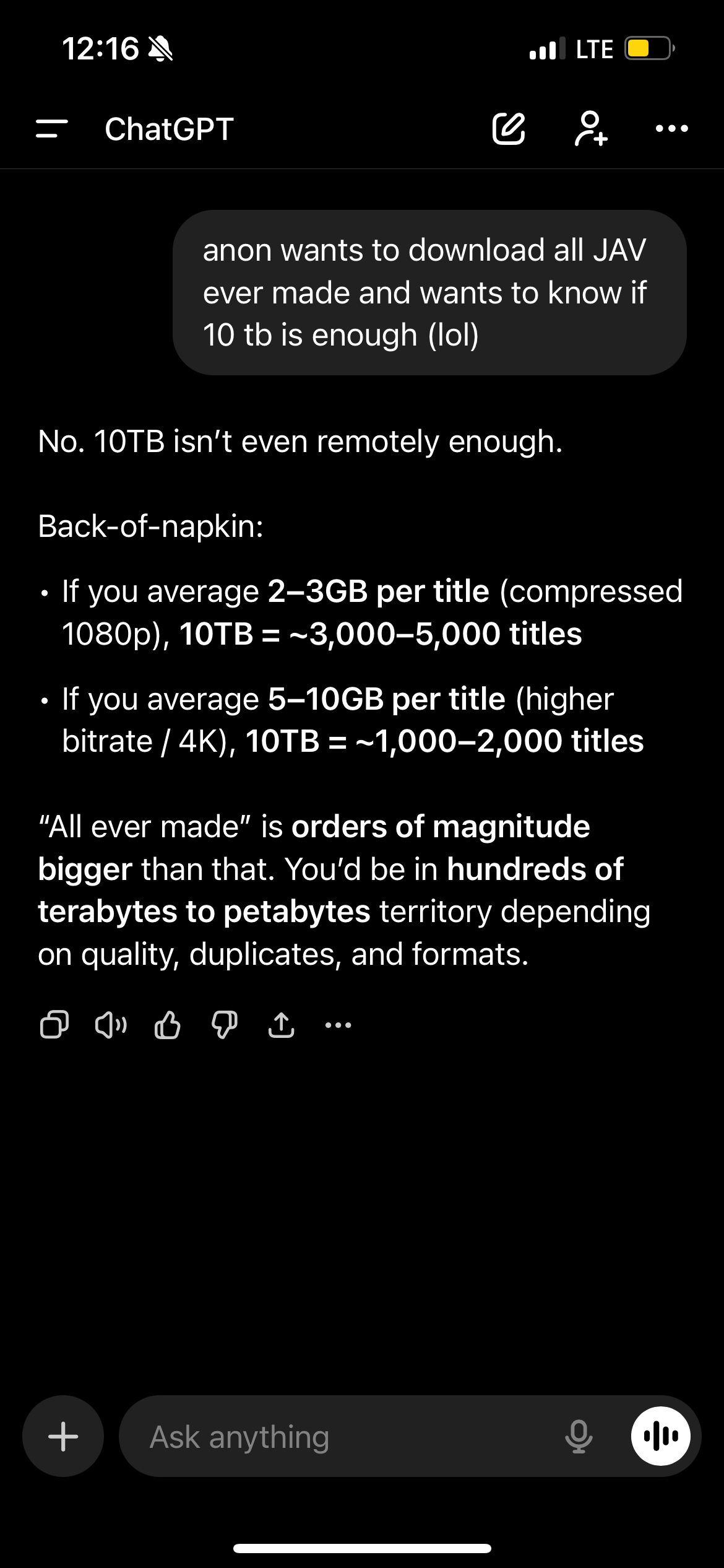 >>107970522I know ChatGPT has confidence bias, but I do appreciate how emphatic it was with respect to just how much JAV there is out there
