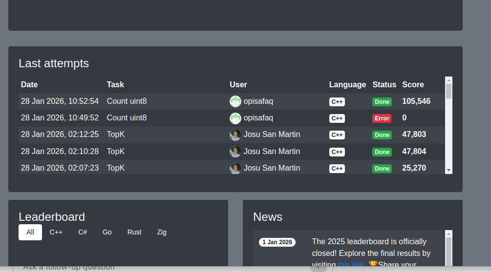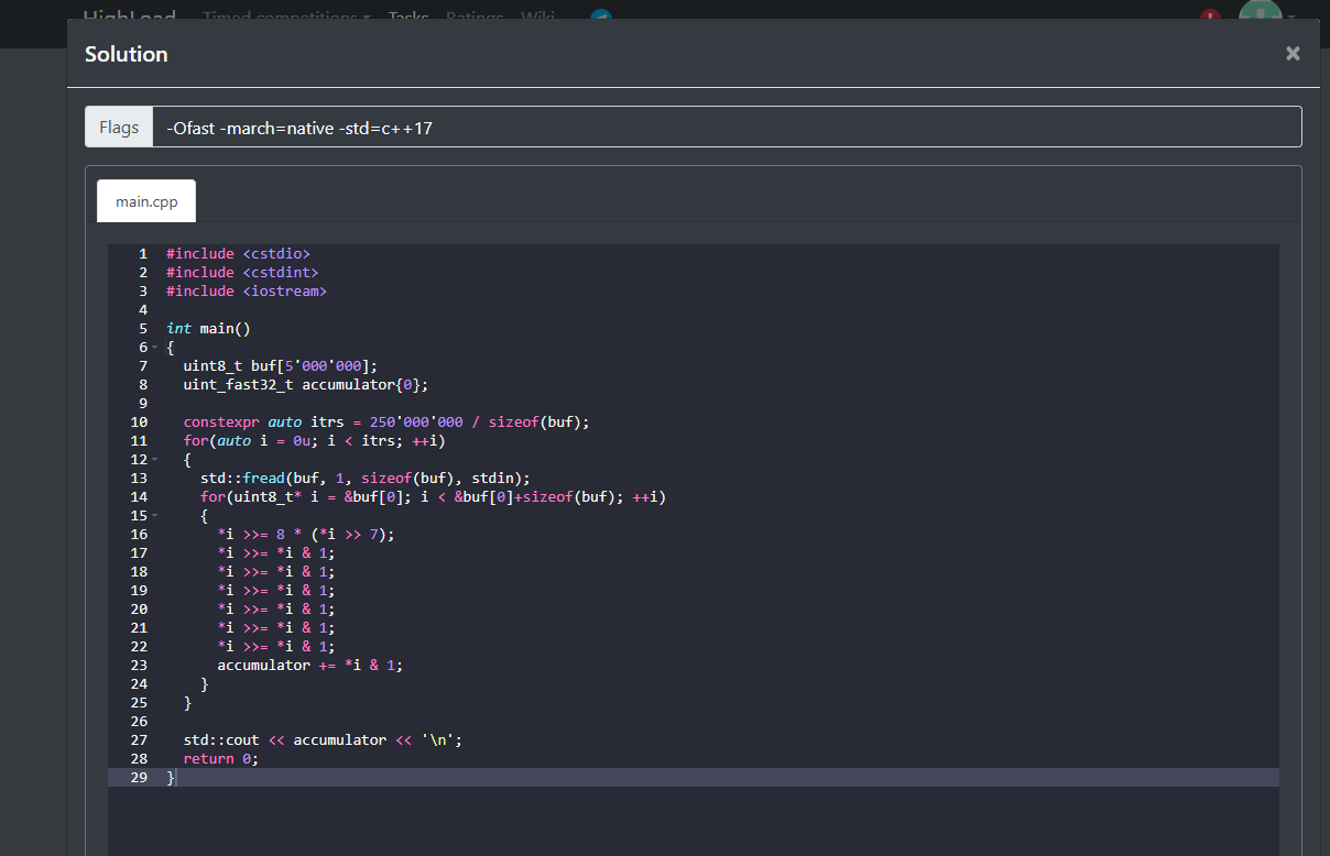 whats your solution? picrel is mine which gets me a score of 300k (was initially 1m before i realized i could turn on march=native & Ofast)