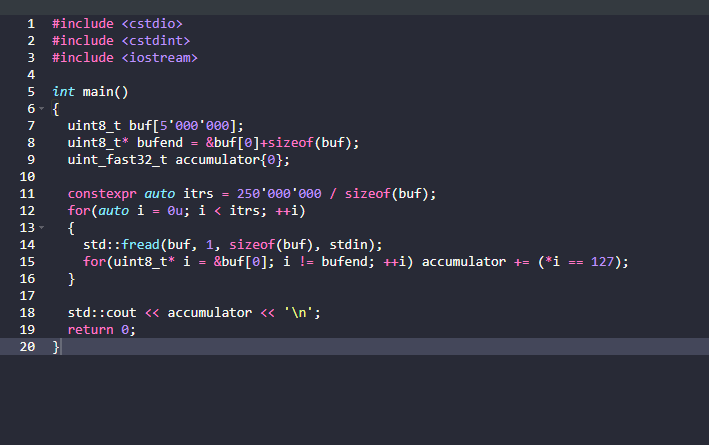 i dont know how to make it faster. The only optimizations i can see in this problem is to not branch and to read into a big stack buffer. Besides the low hanging fruits like iostream formatting final output