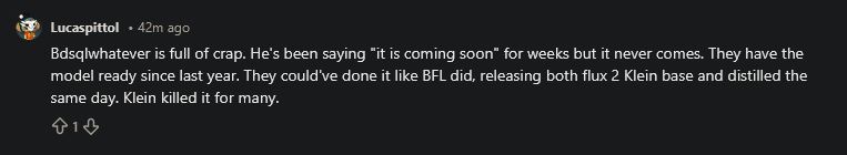 >>107970969I think people have already moved on and are starting to train klein. It's the right thing to do considering how they've led everyone on. Fuck those people. I hope the way they've played this bites them in the ass. In fact, I hope they wait even longer, that way, there will be more klein loras, more klein finetunes, more nodes for klein.