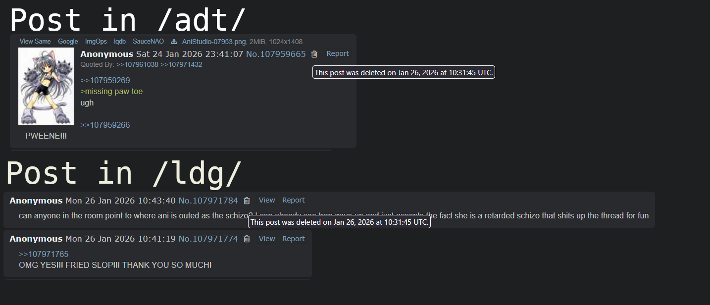 >>107972480>>107972482This, Ani + /adt/ support are probably the culprits of everything./adt/ never had a raid or shitpost of this kind, thats is because Ani amd /adt/ are for sure involved in this.
