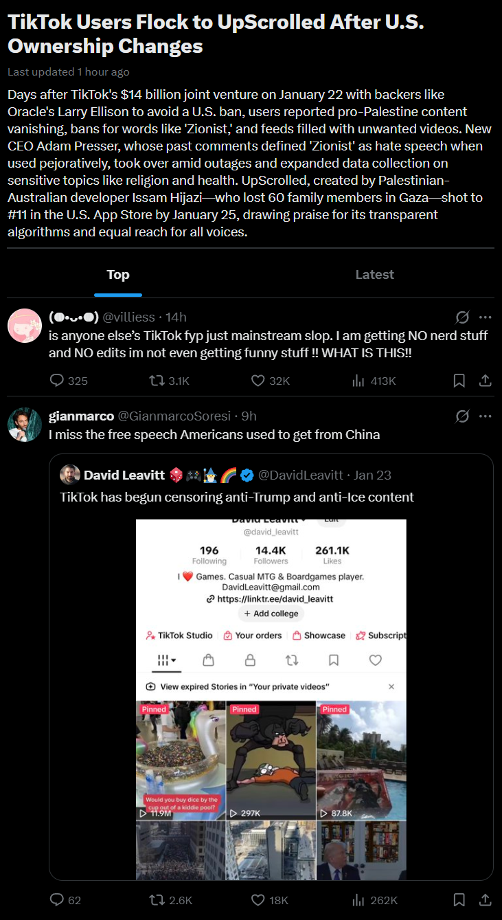 A day after TikTok (USA version) changed hands from China to joint ownership from USA/Israel, users have jumped ship from TikTok to a new app called "UpScrolled". It has already jumped to the #15 most popular app in the USA for January 2026 despite newly launching.Has anybody used it? What do you guys think of it?