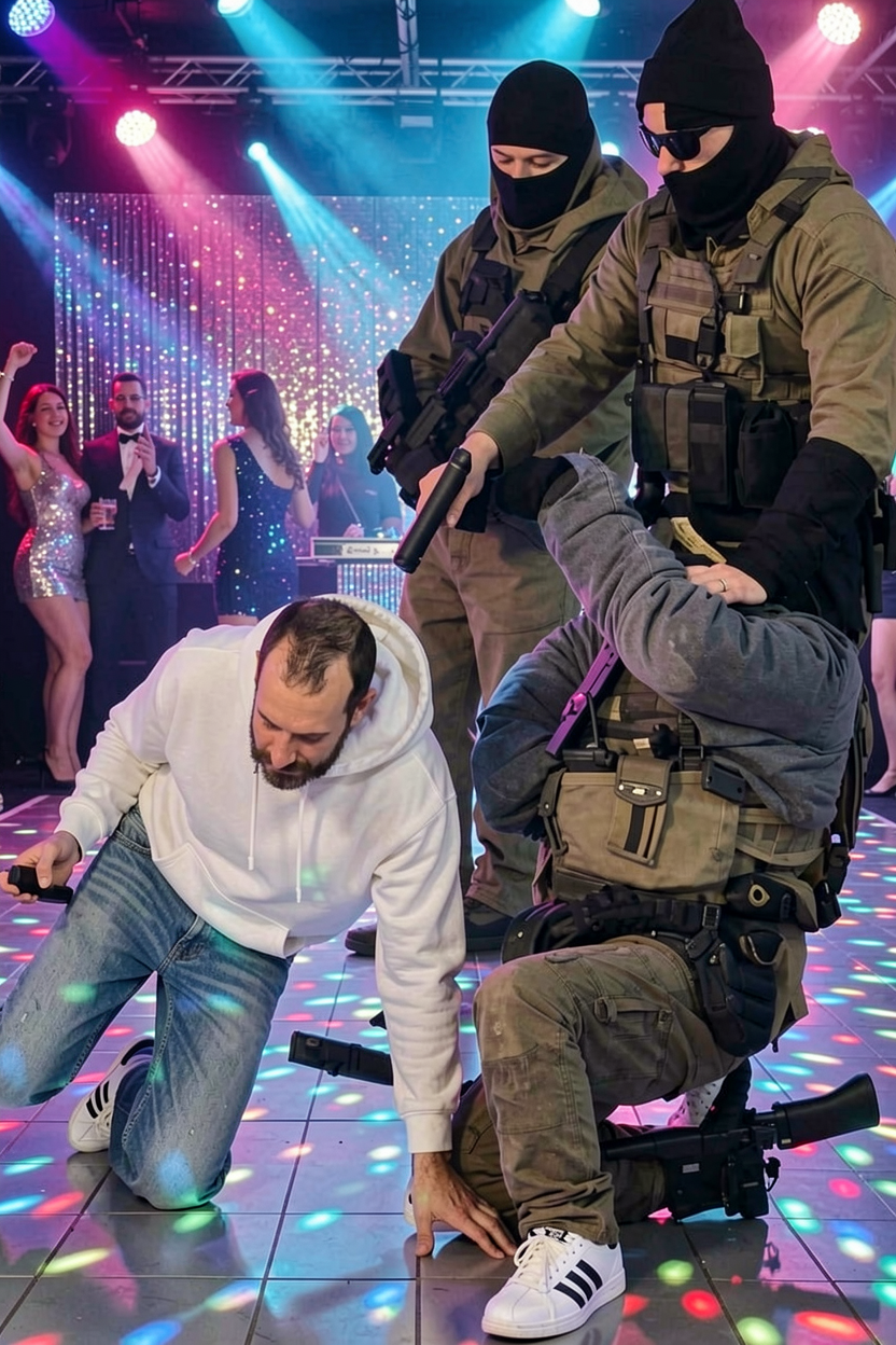 give the man at the bottom left a white hoodie and baggy jeans, and white adidas sneakers. change the background to a disco.