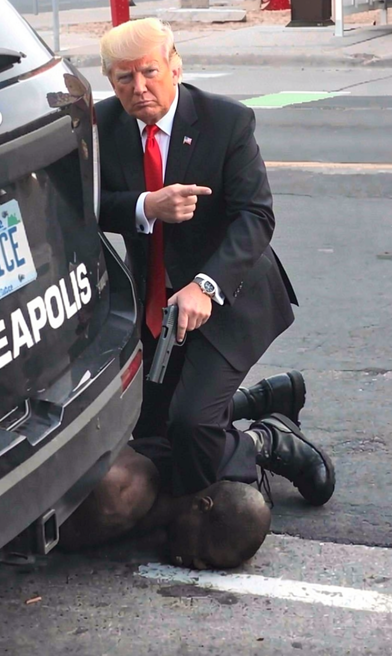 >>107974880replace the man wearing glasses with donald trump in a black business suit in the same pose. he is pointing a gun at the head of the black man on the floor.kek
