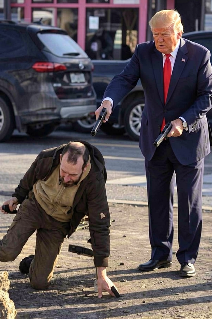 isnt AI fun?replace the man on the top right with donald trump who is standing up and pointing a two black pistols down at the bald man at the bottom left of the image. remove the man at the bottom right. keep the appearance of the man at the bottom left the same.