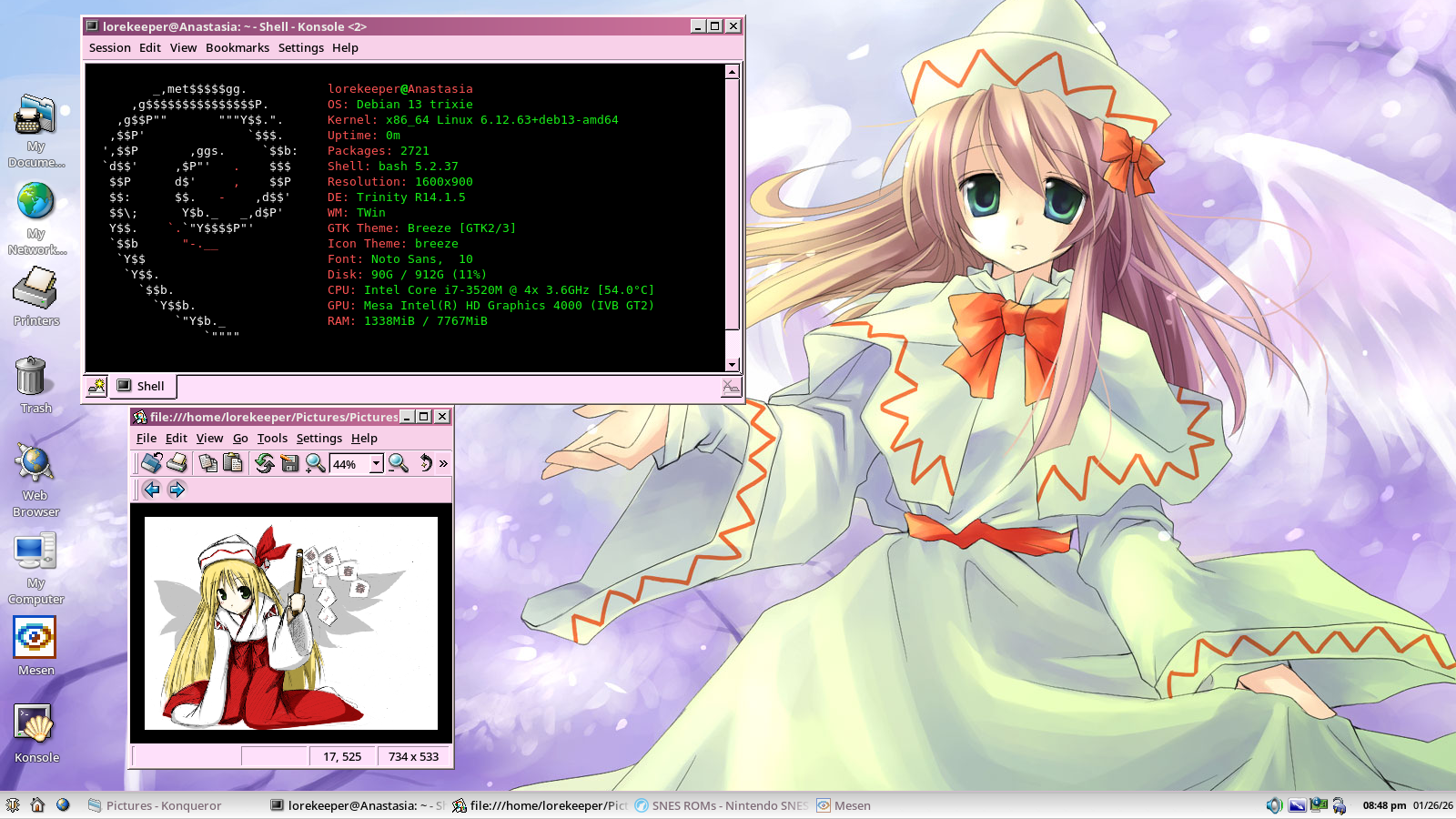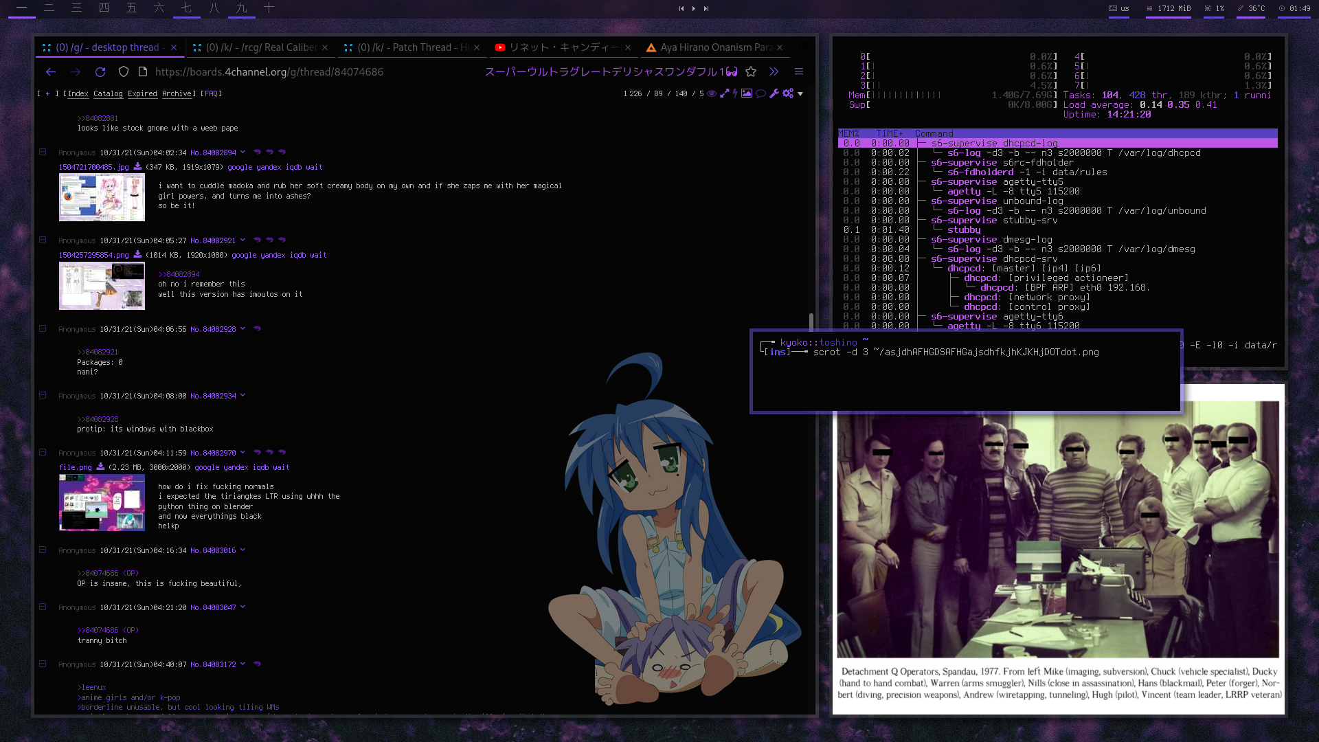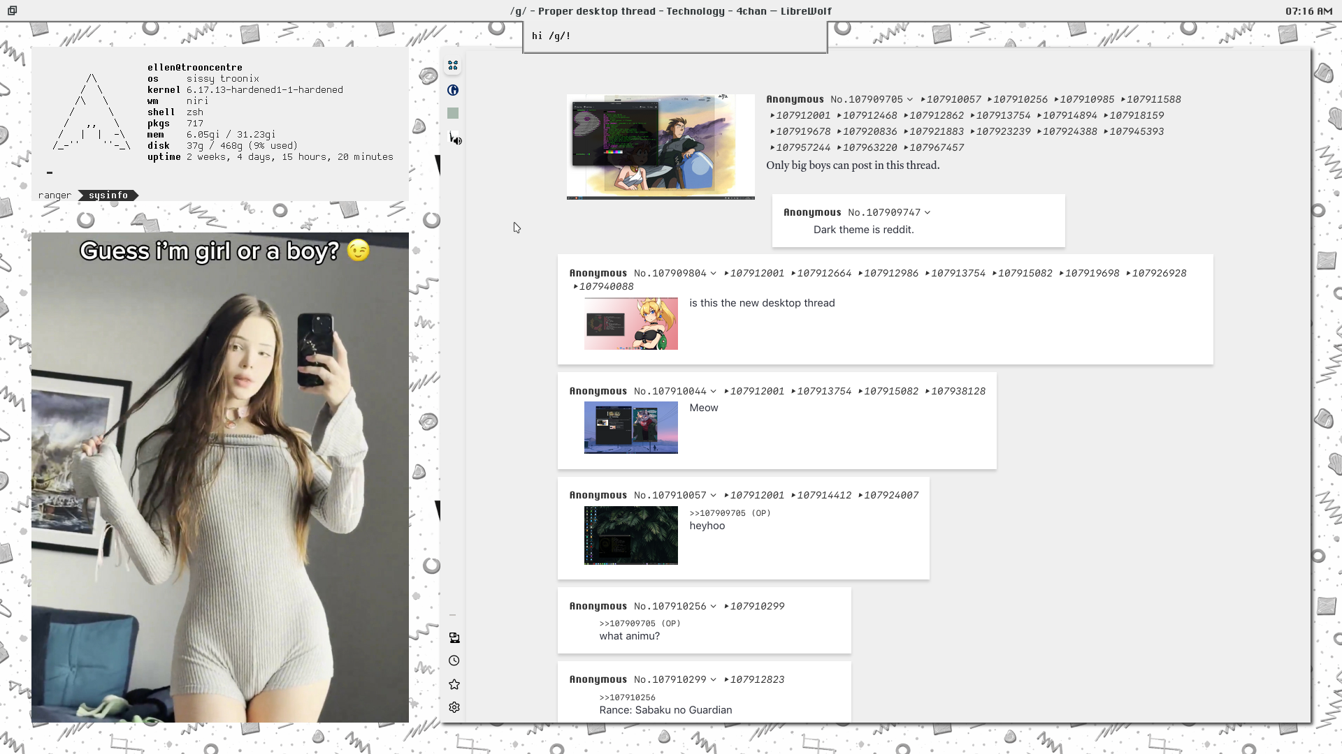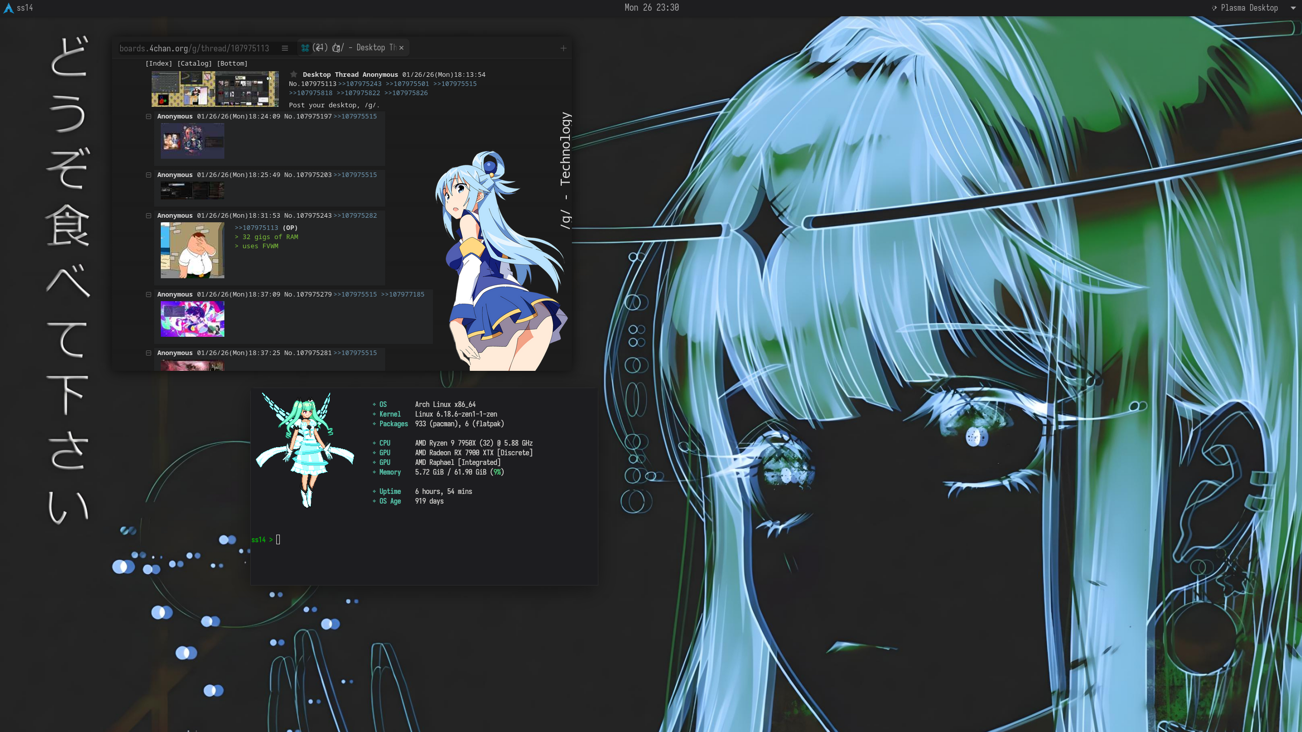 >>107978503i haven't checked my tde setup these days, kind of don't want to either, it's the same yotsuba-colored flcl setup i have shown on earlier threads, i lost interest in trinity honestly, but either way your setup looks good>>107979307alcohol has proven to make me feel more like shit, i can't imagine how drugs feel like, matter of fact i know a friend who is into some drugs, not a pretty sight if you ask me>>107979901i can't wait to see those on my desktop one day, so good. i can't help but think of one thing though, it must've been so annoying for you with people including me asking me, i want to ask you if you give yourself time away from all this, ask you how's life going on, what else are you excited to share and all that?>>107983958works like shit you mean, i've done better than you on picrel (w10 iot ltsc 2022) and let me tell you it still worked like shit, usin' linux-only for about a year straight (before that it was on and off dualboot) and i've never been any happier>>107986068rubbish windows 11 modded iso