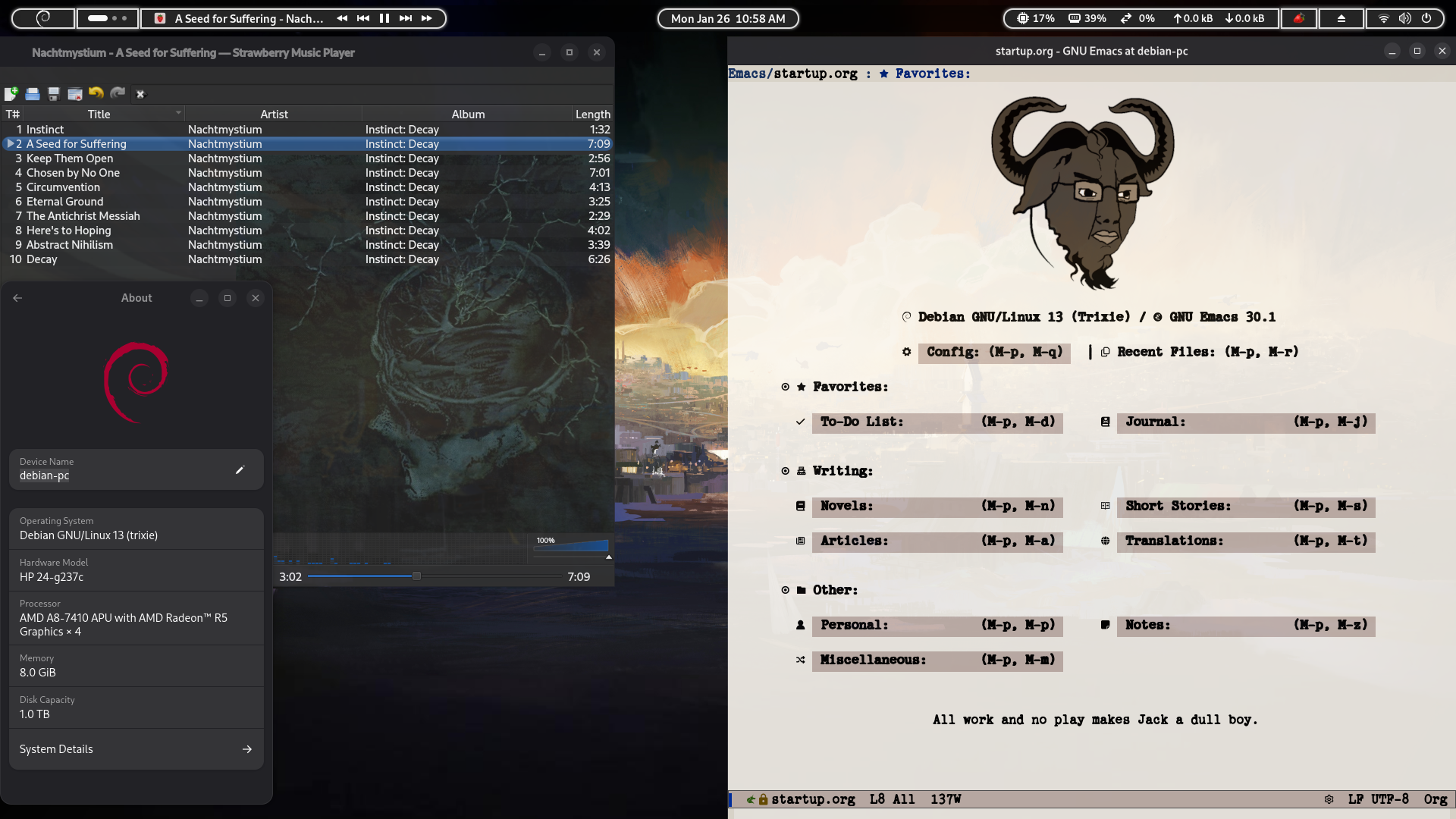 >>107977067no suspend, notably. disabling the intel ME and having the option of open source bios or bootloader payload is something money cannot buy. so it's worth it to at least have one machine like that. so to improve it, i want bootup to be as fast as possible. emacs daemon can start on boot too ofc, and it does resume state pretty well. so if you only use emacs and the boot time is good, a full reboot feels just like hibernate/suspend.