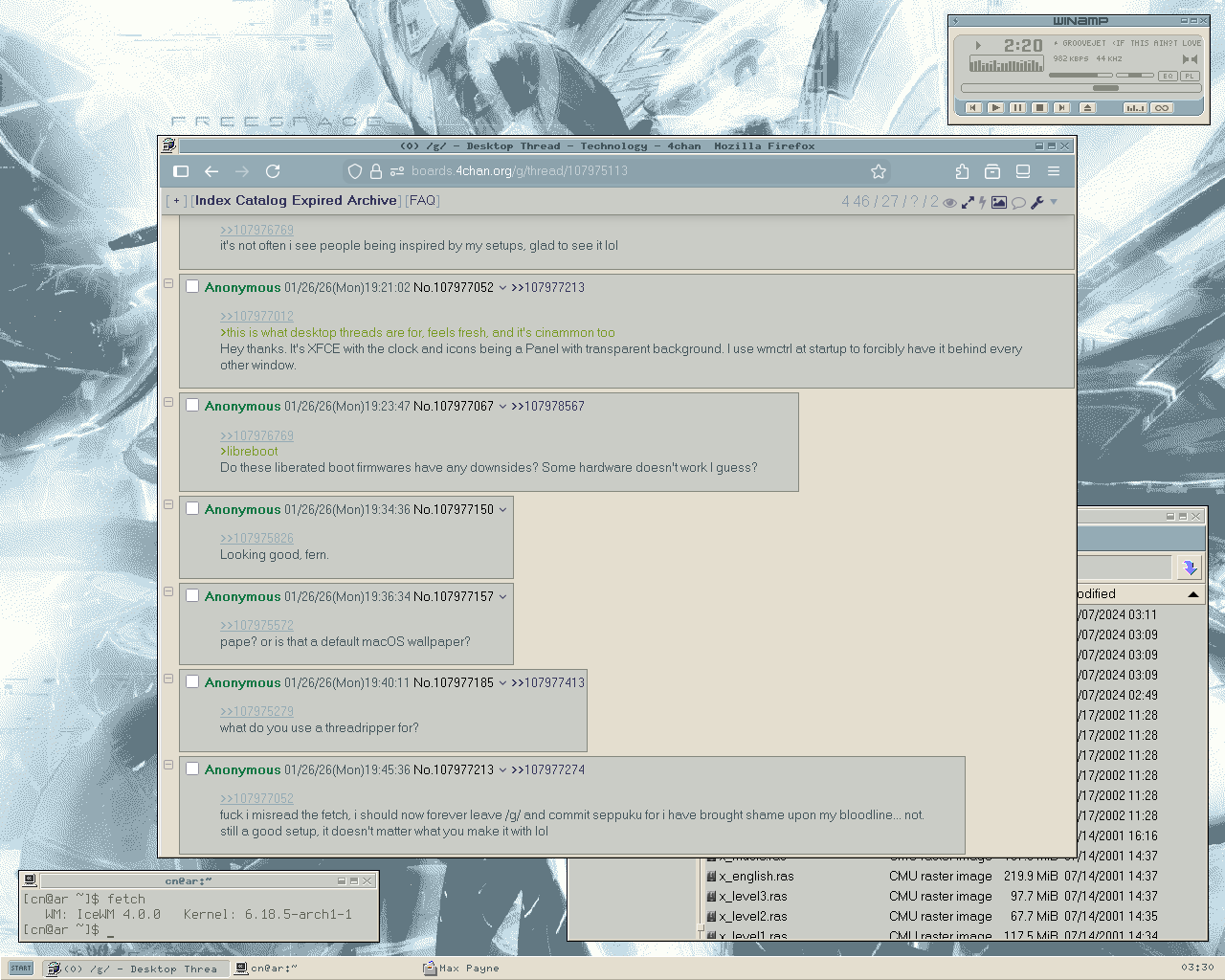 >>107987456>You mean this guy? I still have some of those pics somewhereYes! His desktops are so nice! That is the primary reason I got into FVWM, so I could make my desktop like that.