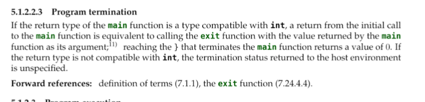 language defines language. operational conditions are defined by OS. the LIBC or stdlib or "standard" may abstract those conditions some on compiler side (by injecting libc runtime code into binary), some via providing exit() wrapper.