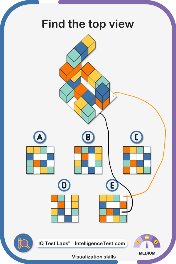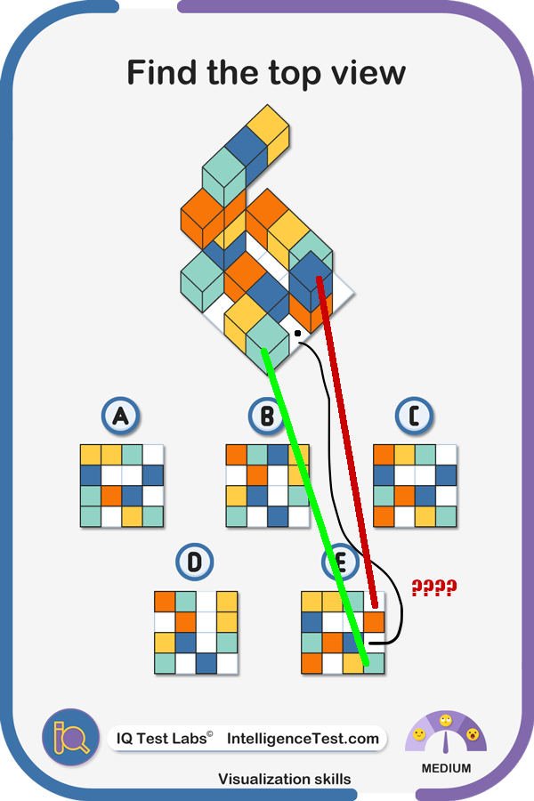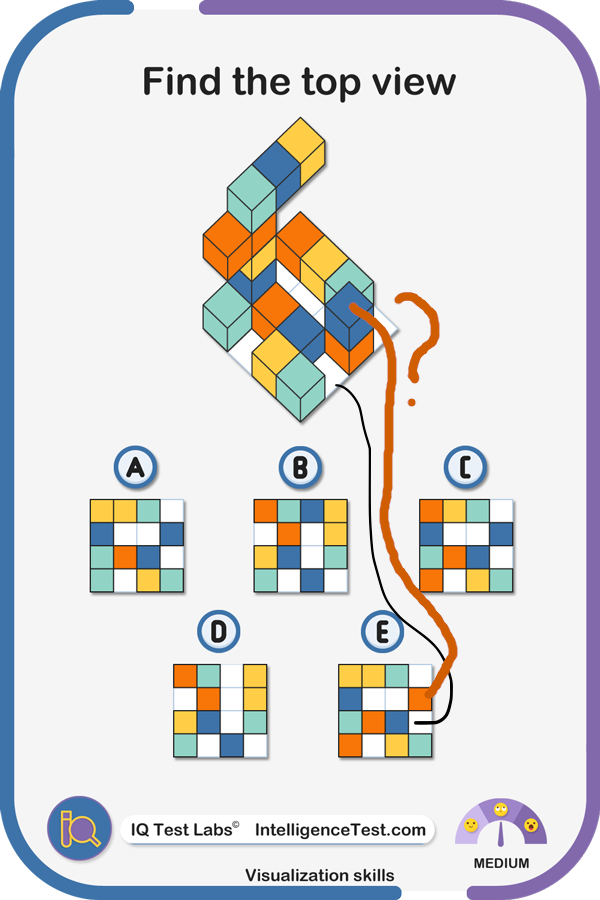>>107984240B is similar but rotated 90 degrees.The only difference is the orange square in E above where you drew the line to is blue in B, and blue is correct because it sits above the orange cube.