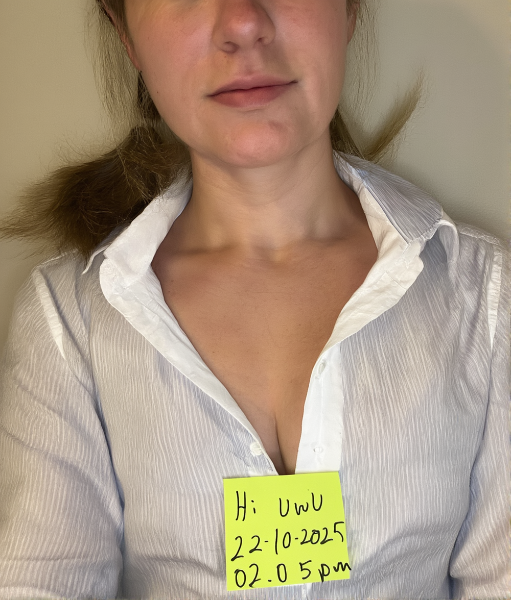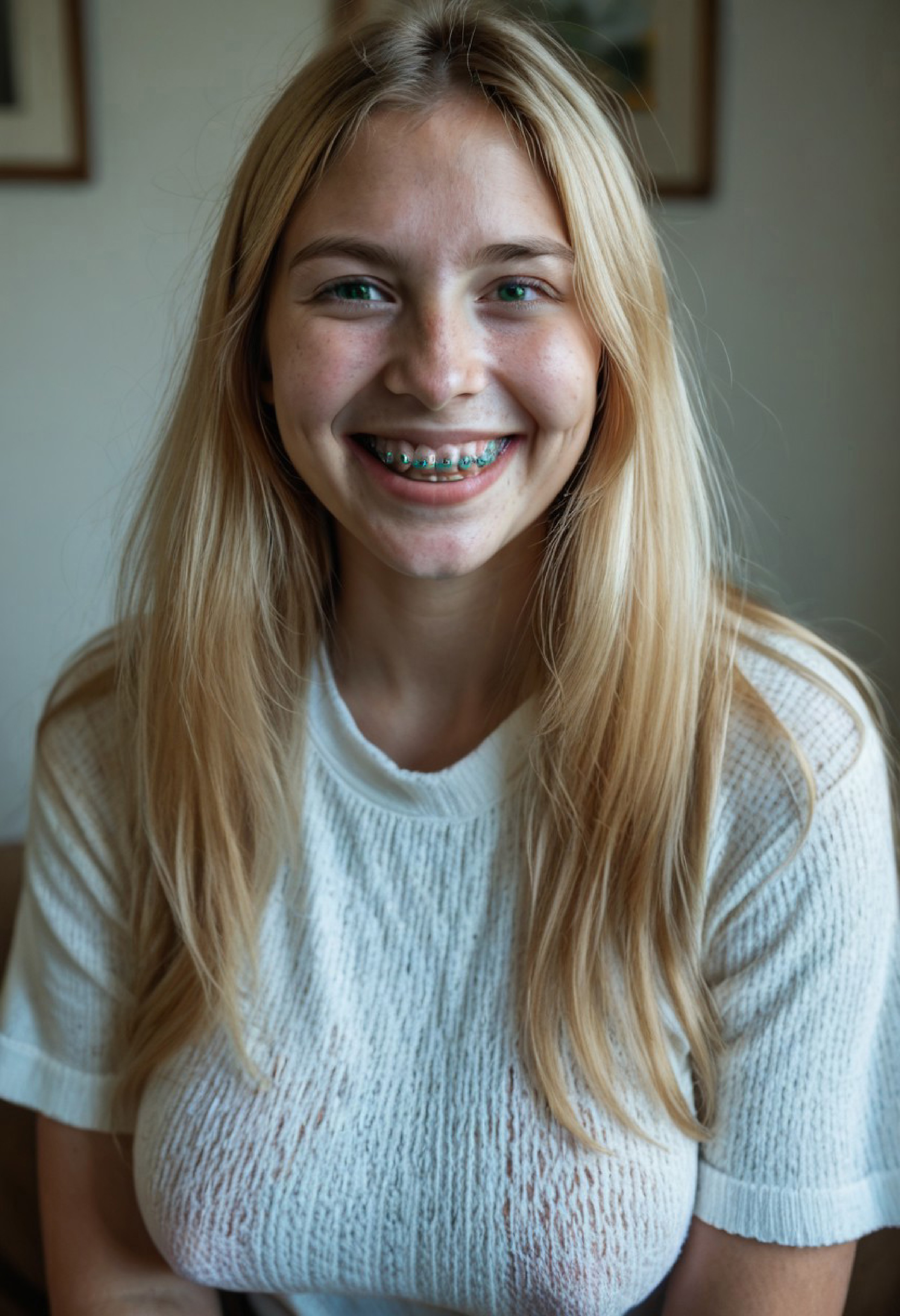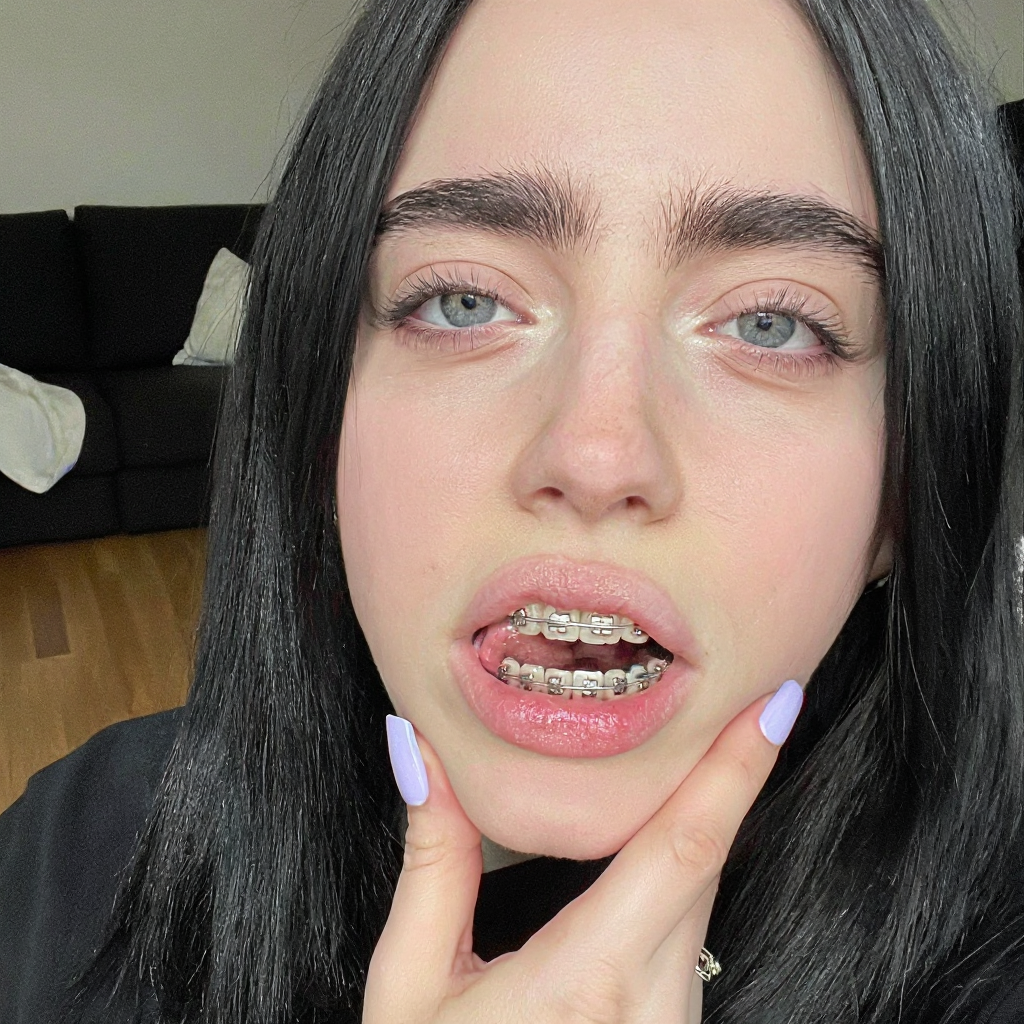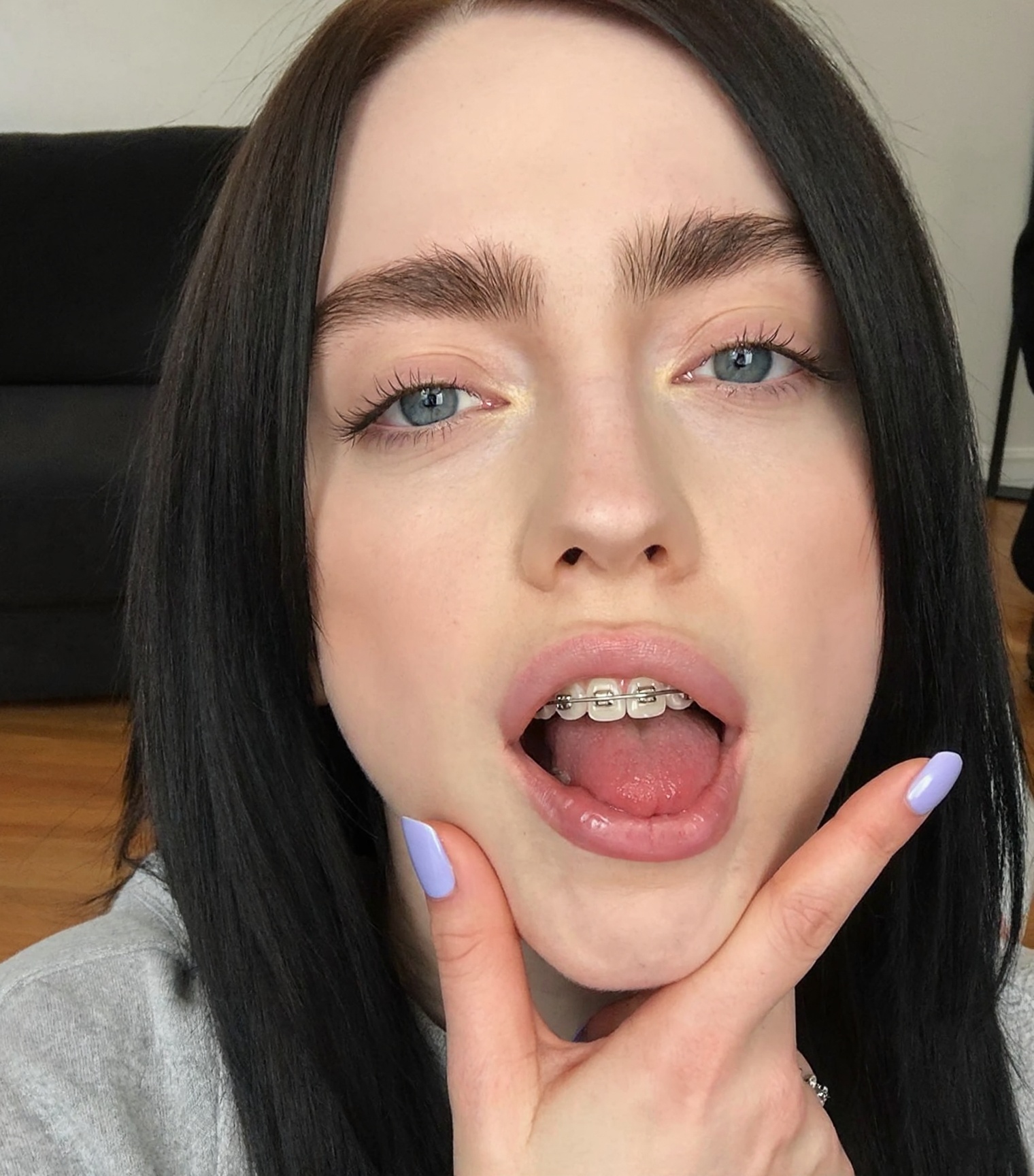A photo of Billie Eilish. A photo showing a close-up of a young woman with fair, almost pale, fair skin and long, straight black hair. She has round large blue eyes, well-defined eyebrows, and long eyelashes. Her mouth is open wide, revealing a set of silver braces and a tongue that is partially visible. Her lips are slightly parted. Her right hand, with long, manicured nails painted in a light purple color, is gently holding her chin. The background is blurred but shows a black couch and a wooden floor. The lighting is bright and even, highlighting her facial features and the texture of her skin. The style of the photo is explicit and erotic. The overall atmosphere is intimate and provocative.
