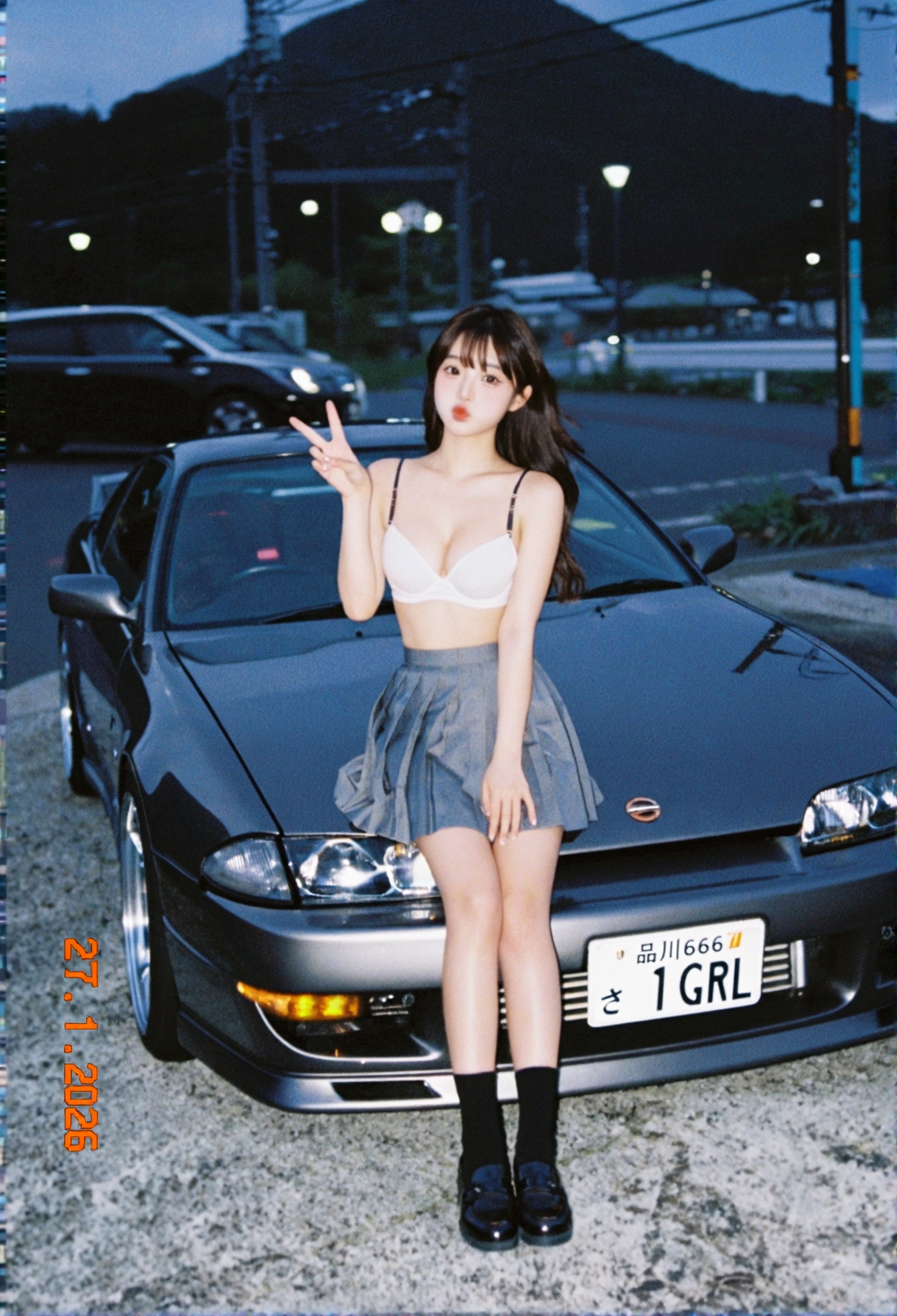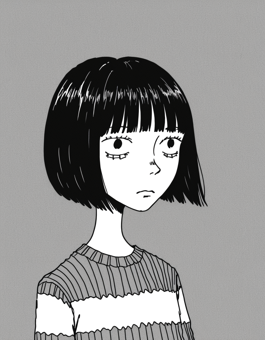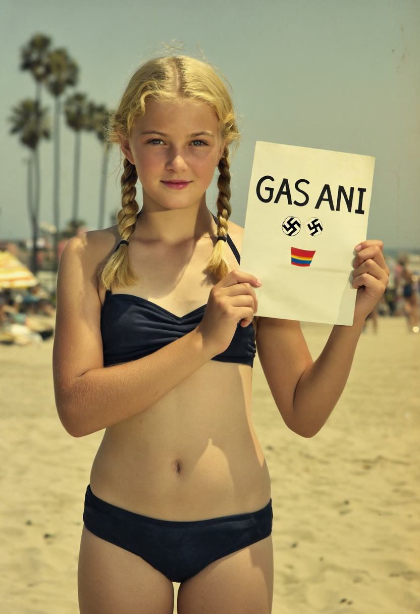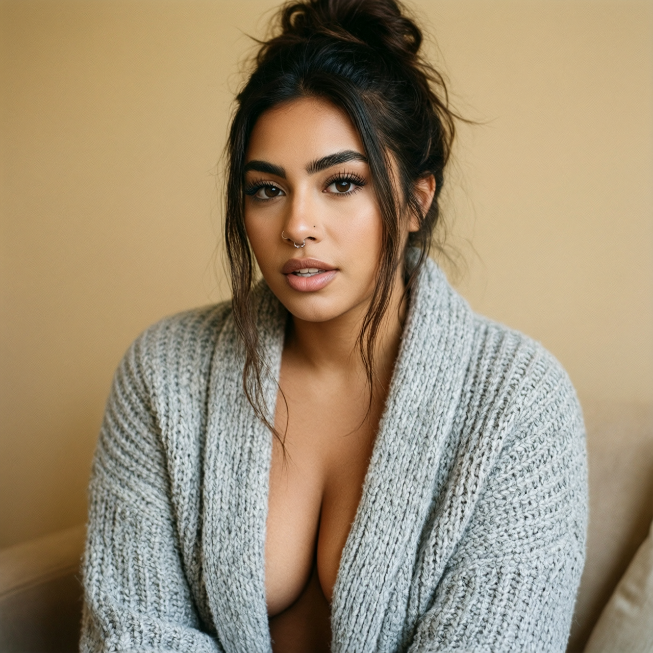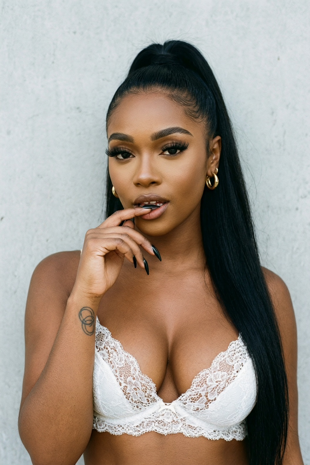 A photo of Billie Eilish. A photo showing a close-up of a young woman with fair, almost pale, fair skin and long, straight black hair. She has round large blue eyes, well-defined eyebrows, and long eyelashes. Her mouth is open wide, revealing a set of silver braces and a tongue that is partially visible. Her lips are slightly parted. Her right hand, with long, manicured nails painted in a light purple color, is gently holding her chin. The background is blurred but shows a black couch and a wooden floor. The lighting is bright and even, highlighting her facial features and the texture of her skin. The style of the photo is explicit and erotic. The overall atmosphere is intimate and provocative.